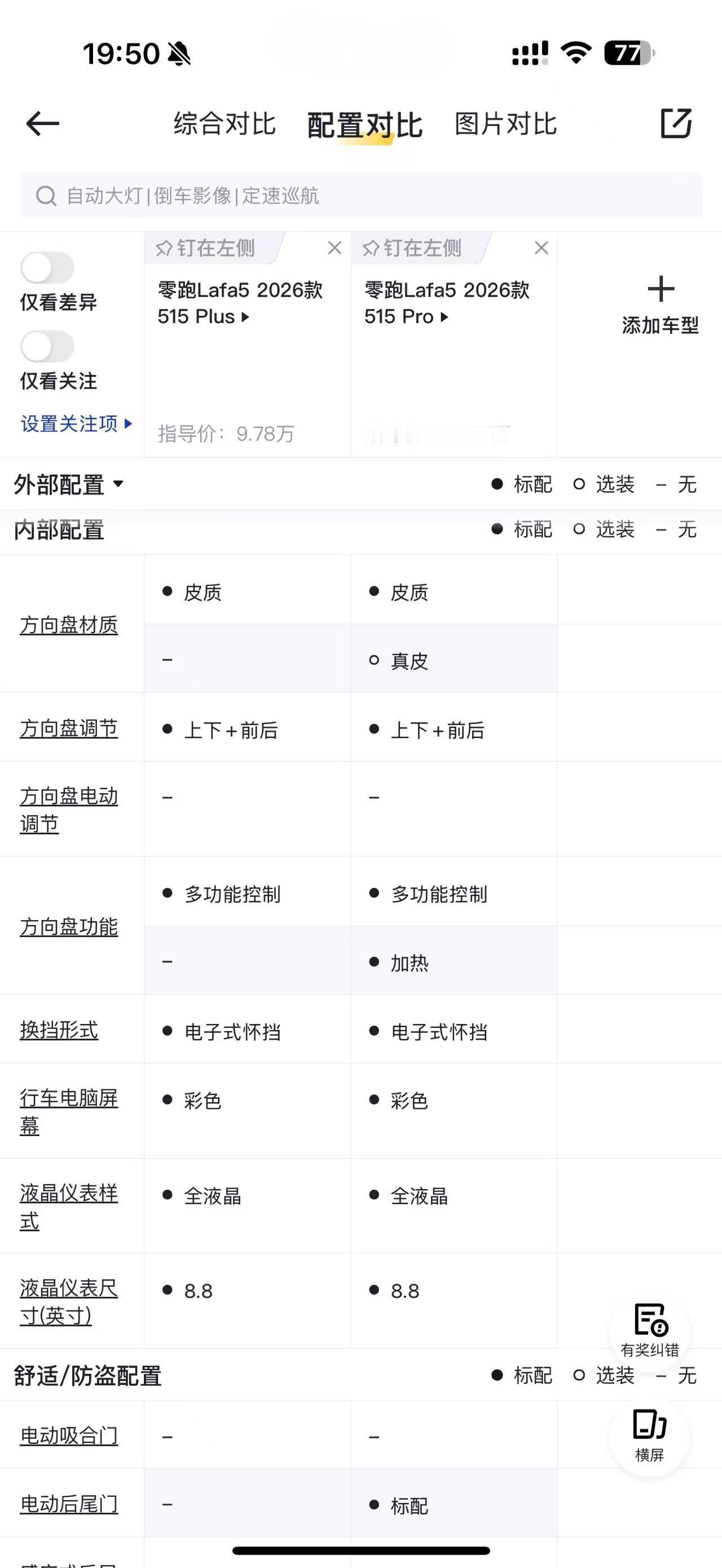 【有必要加8000买零跑Lafa5 515pro版吗】 零跑Lafa5 515plus和515Pro这两版本价格差了8000,我看参数配置,pro版也只是多了座椅加热 / 通风、方向盘加热、全景天幕、12扬声器、电尾门、侧气帘这些,虽然说舒适度和质感会好些,但是我就日常代步开,有必要加钱买吗?求大神指点【来自懂车帝车友圈】