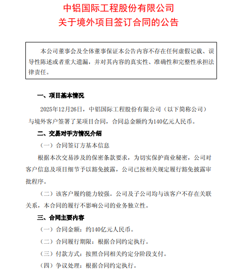 12月26日,中铝国际(601068.SH)公告称,公司于2025年12月26日与境外客户签署了某项目合同,合同总金额约为140亿元人民币。