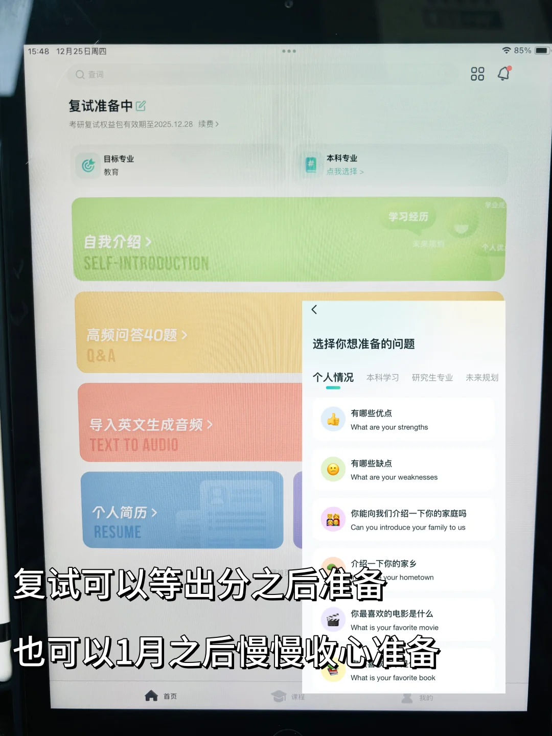 2、英语面试:主要是自我介绍+日常问答+专业英语问答(了解清楚自己的备考院校的考查方式)