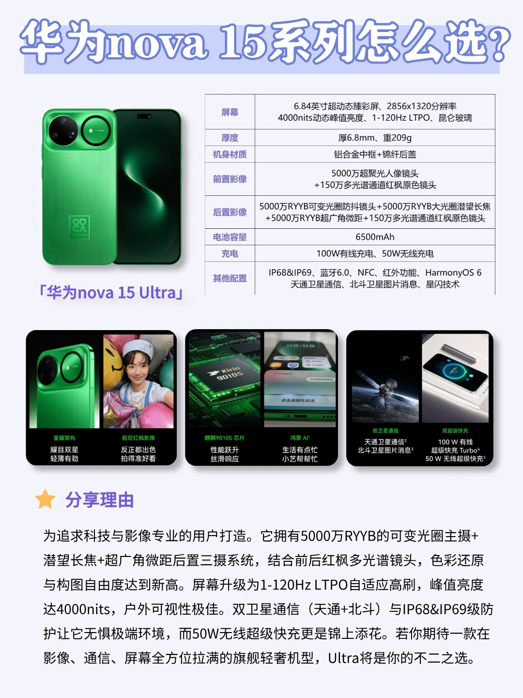 [自拍R]刚刚发布得华为nova 15系列怎么样呢?值得买吗?三款机型怎么选择呢?今天来给大家分享一下~ [星R]华为nova 15 如果平时以日常使用为主,看重续航和综合体验,这款比较合适。配置6000mAh电池,用起来比较省心。100W快充补电也快,前置搭载5000万超清人像镜头,拍人拍景色彩自然。支持北斗卫星消息,外出时多一种联络方式。整体设计比较轻巧,适合喜欢简约、追求实用性的同学。 [星R]华为nova 15 Pro 喜欢拍照,尤其是常用人像和广角的话,Pro的配置更到位。它在nova 15的基础上,不仅前置配置了红枫影像,后置也增加了1300万RYYB超广角微距镜头,使构图更灵活,色彩更还原。屏幕升级到6.84英寸臻彩屏,支持自适应刷新率,日常滑动和看视频的观感比较流畅。整机依然保持轻薄手感,适合对拍照和屏幕都有一定要求的用户 [星R]华为nova 15 Ultra 如果经常外出,或有更全面的拍摄、通信需求,Ultra的表现更周全。后置镜头组加入了5000万RYYB可变光圈防抖镜头和5000万RYYB大光圈潜望长焦镜头,拍摄适应性更强。前置也配置了红枫影像,能更加还原真实肤色与妆容细节。同时支持天通+北斗双卫星通信,在户外环境下联络方式更多样。屏幕亮度和无线充电也有相应提升,适合对手机功能要求比较广泛、希望一步到位的使用者。 [派对R]总的来说,三款都搭载HarmonyOS,标准版适合预算有限、追求实用的学生党 / 职场新人; Pro 版兼顾性能与影像,是大多数人的闭眼之选; Ultra 版则能满足对旗舰配置、外出拍照有更高需求的用户,选择时,根据自己的需求来考虑即可。[萌萌哒R] [自拍R]nova 15系列12月25日已经开售,入手后更能直接解锁价值 800 元的新机权益礼包,[喝奶茶R]12 月 31 日前购机还能限时拿到最高 249 元的 HUAWEI Care + 一年期权益,有了功能加持再加上售后保障,日常用机既省心又安心~ 数码新品抢先看 数码大玩家 数码资讯 华为 华为手机 华为nova15 华为nova15系列 手机推荐 手机分享 nova15带感绿够带感 此刻枫头正劲 超级nova超级香 nova15反正准出片