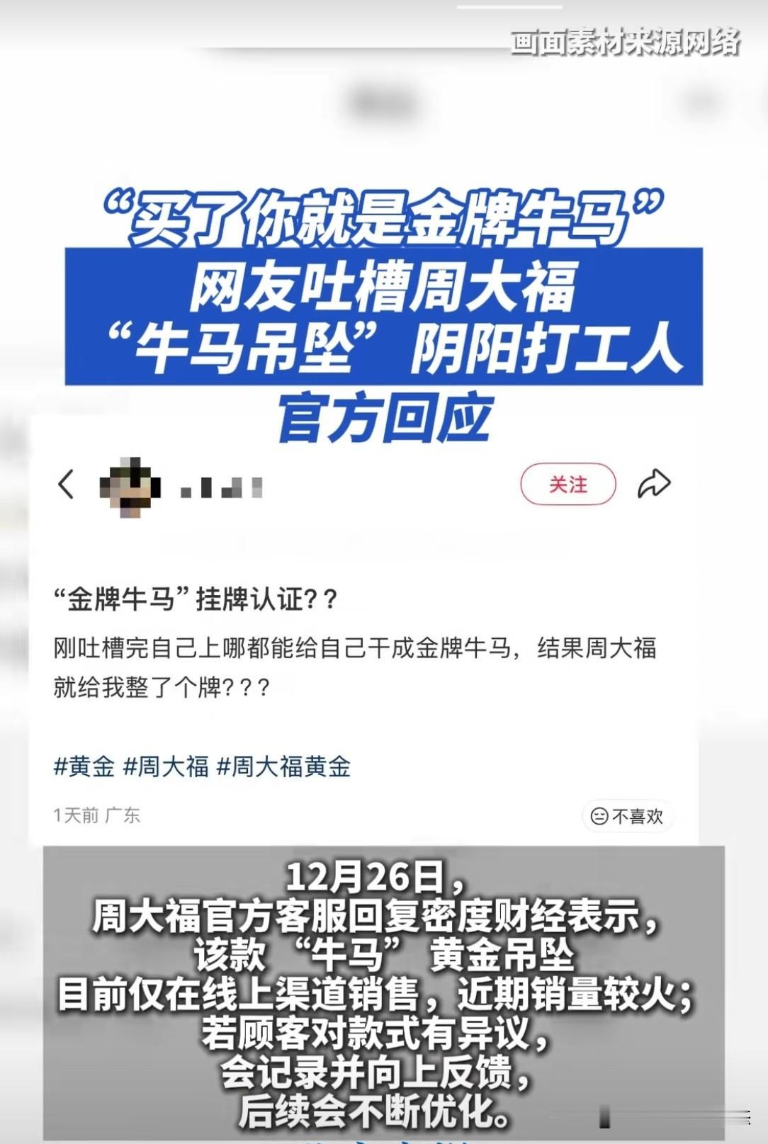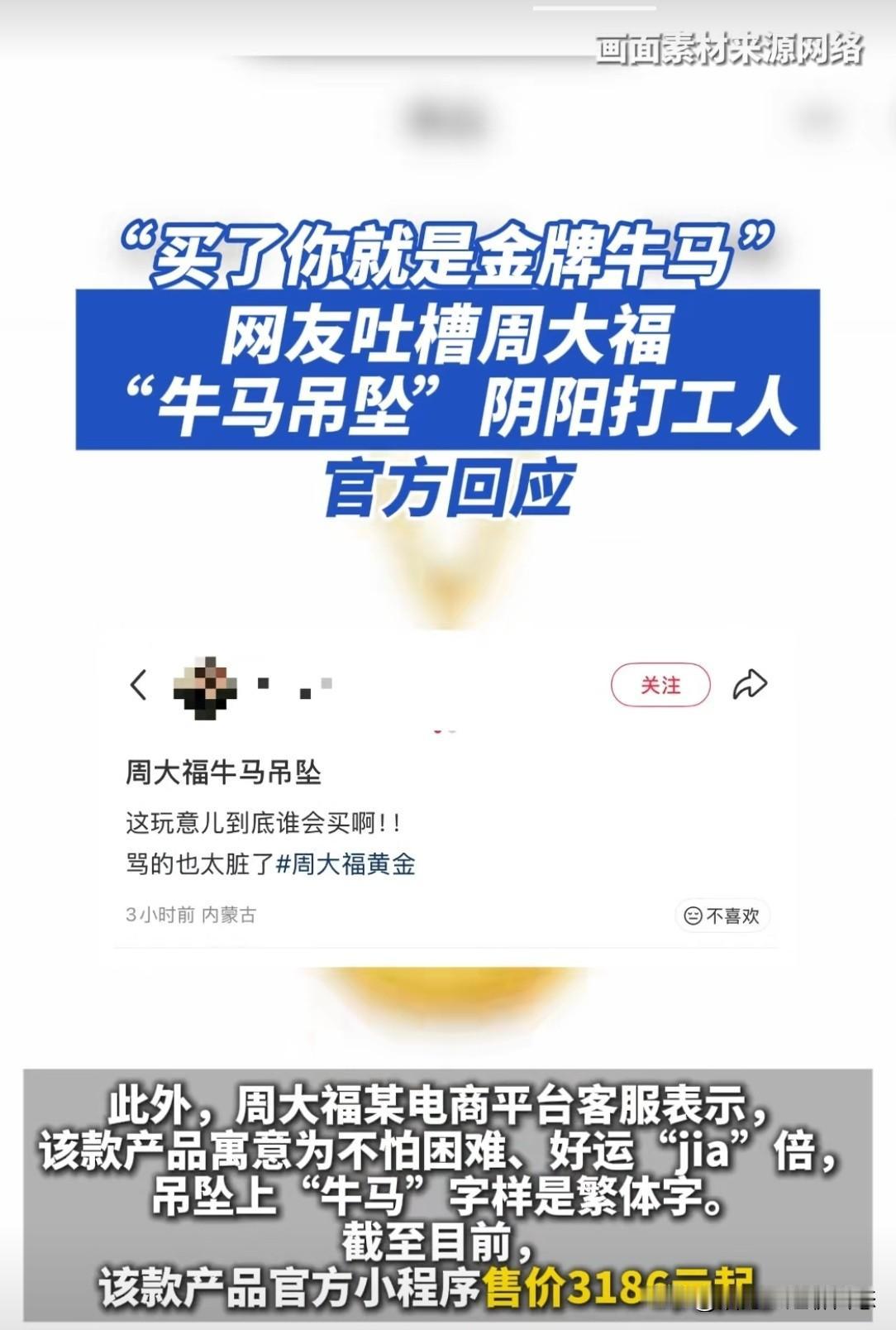 周大福成“阴阳打工人”? 网上售卖的周大福“牛马吊坠”,让不少人心里犯膈应,这是怎么回事?是今年黄金价格一路飙升,就开始瞧不起打工人了?瞧瞧网友吐槽后官方的回应,是不是还有点高高在上的意味呢?