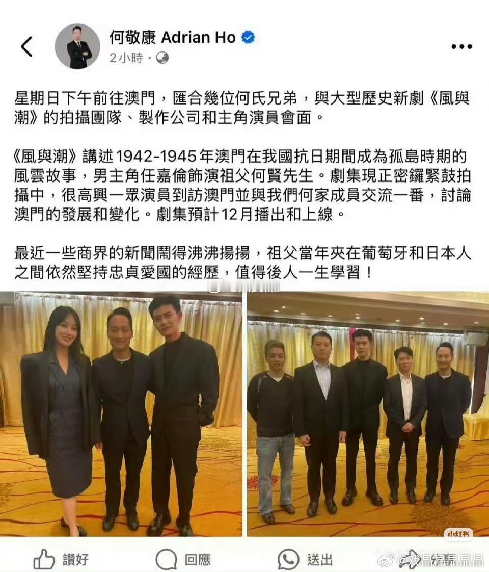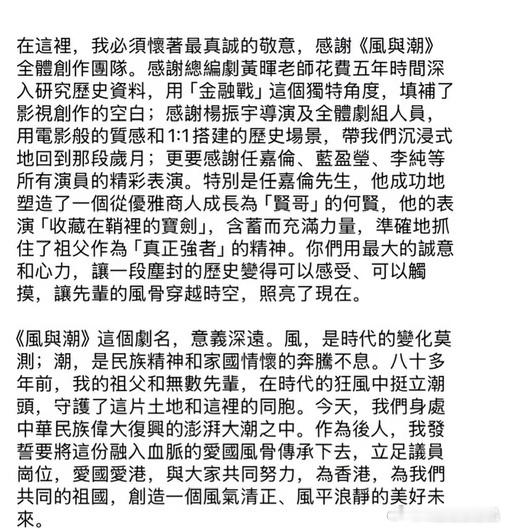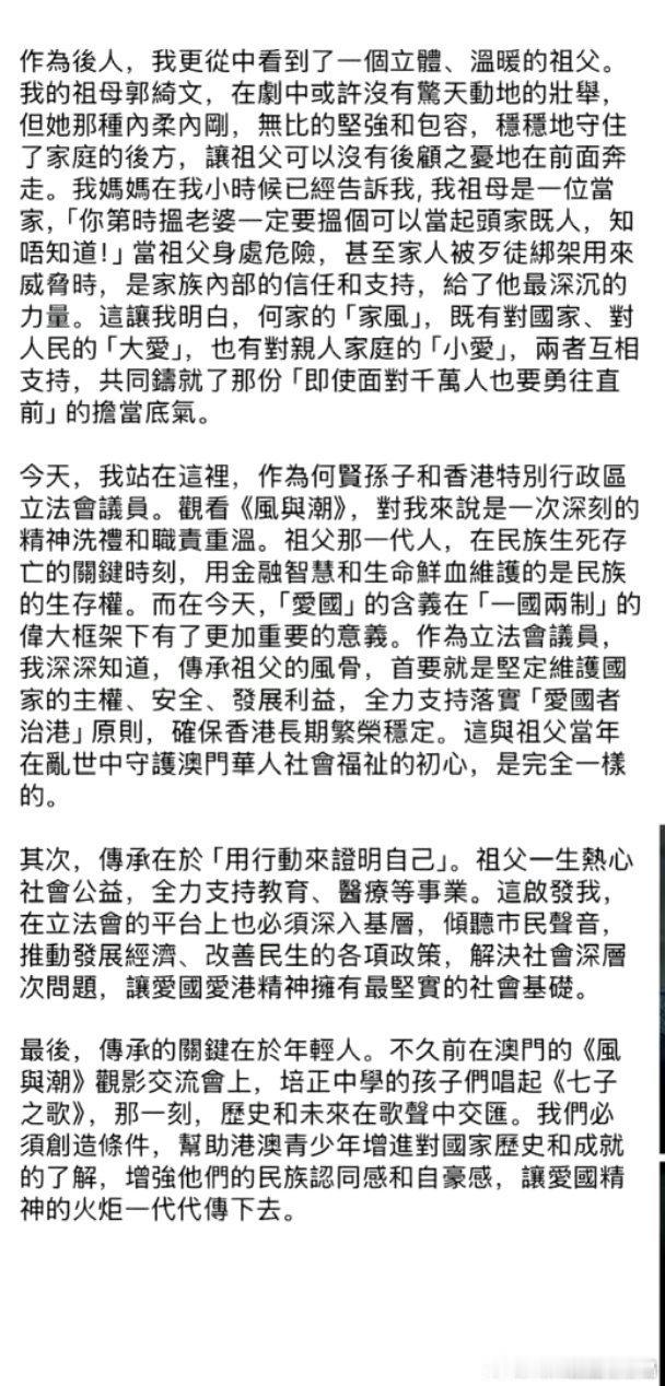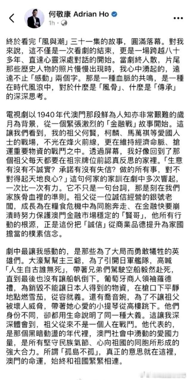 何贤后人何敬康先生发文赞誉风与潮!电视剧风与潮 何敬康先生说电视剧《风与潮》让他对“风骨”和“传承”产生深深的思考!剧中重点着墨的何氏家训让他产生强烈共鸣,回忆祖父何贤先生的不变信念“诚信”!也谈到对风潮时期的理解和对自己维护国家的主权、安全和发展利益、全力支持落实“爱国者治港”原则,确保香港长期繁荣!文章里不但感谢《风与潮》主创团队的精心制作,文末还特别感谢了演员任嘉伦任嘉伦风与潮 :以精湛演技塑造了何贤先生。他的表演如“藏于鞘中之剑”,含蓄而充满力量,精准诠释了从儒雅商人到担当大义的“贤哥”的成长与风骨,令人动容!