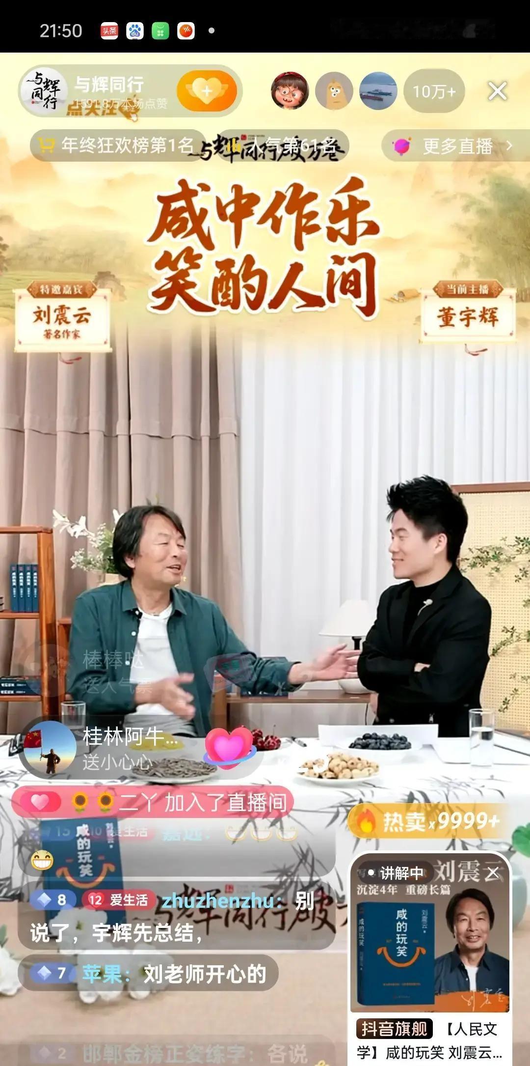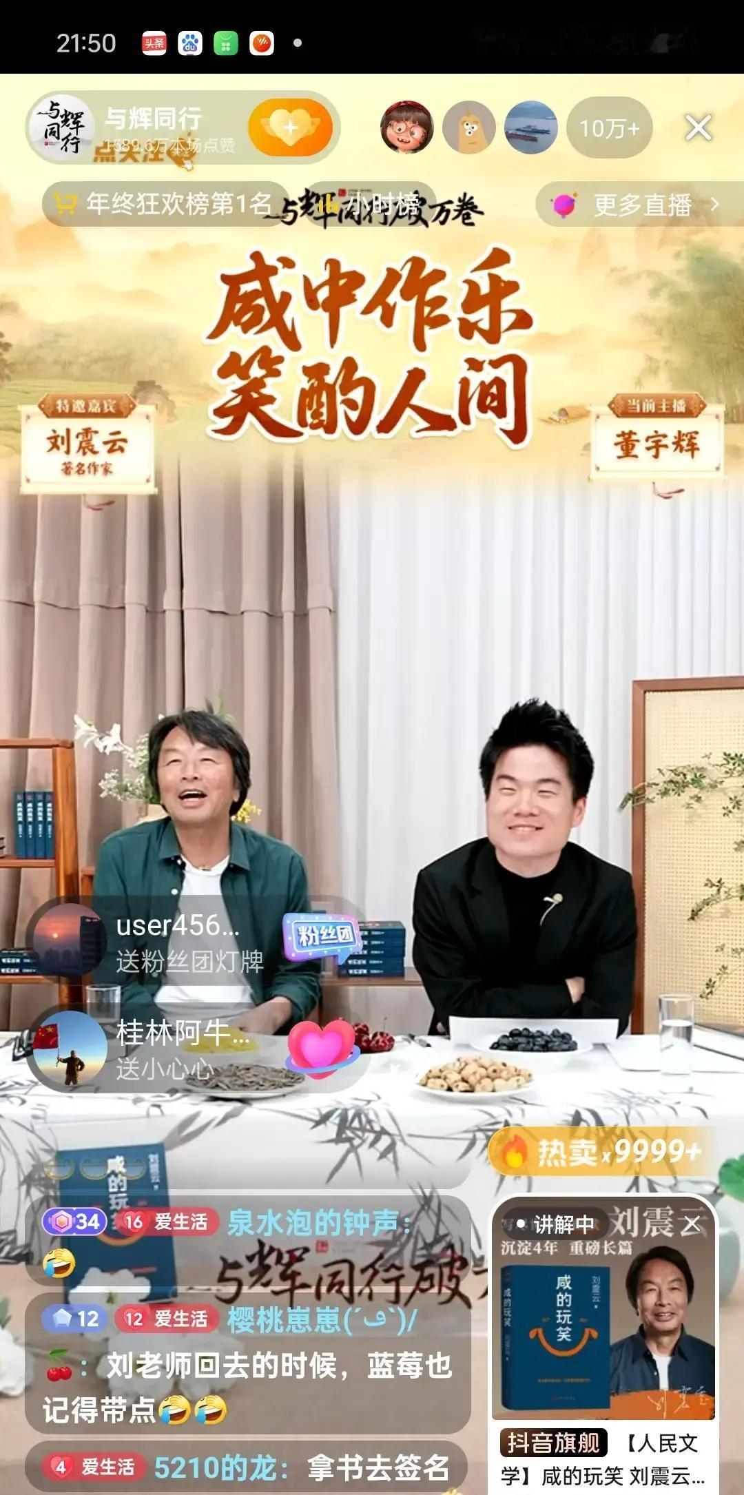 刘震云昨晚进了董宇辉的直播间,开口就一句“我是来偷灵感的”,说完真掏出手机翻弹幕,看到“生活像涮羊肉,看着热闹其实挺薄”直接笑出声,说这句得写进小说。