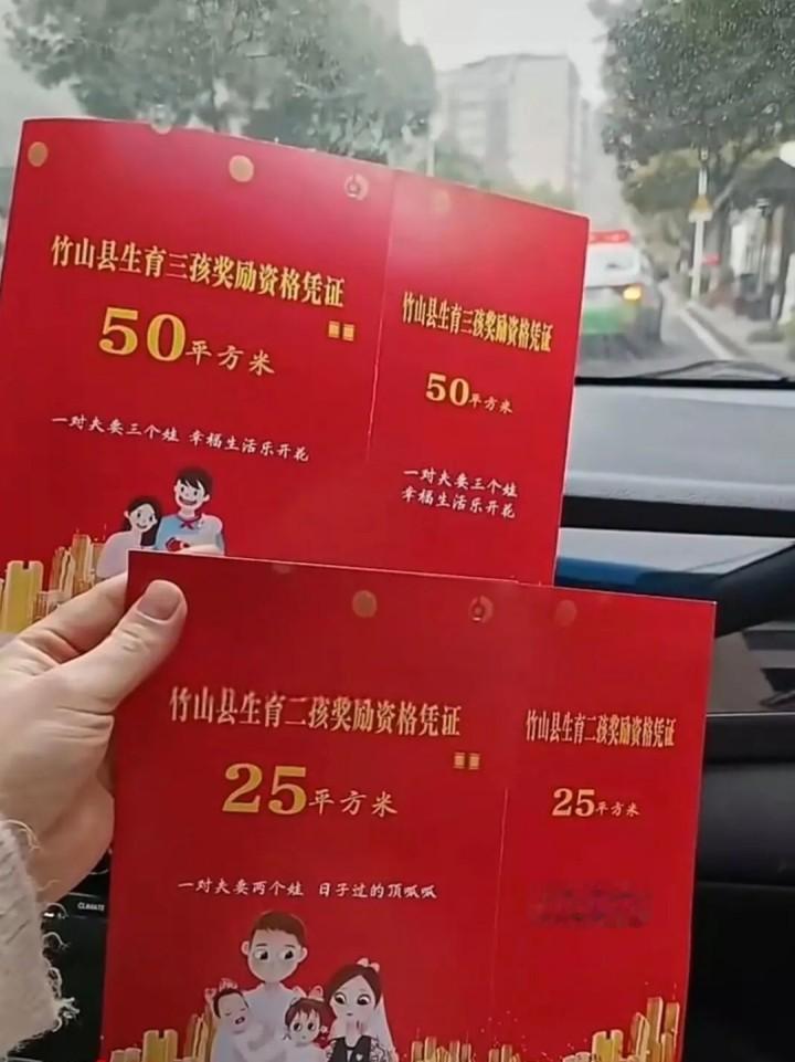 记者注意到,已有当地多名网友在社交平台发布视频和“红本本”,称享受到了政策福利。其中,2024年4月,一位当地居民在社交平台晒出的“竹山县生育三孩奖励资格凭证”上写有“50平方米”字样,在凭证内的政策须知中提到,该政策享受对象要求夫妻一方属于竹山户籍,该子女户籍登记在竹山县。2021年6月1日至2026年6月1日期间生育的二孩及以上的家庭,在竹山县城、宝丰镇指定区域楼盘购买商品住房,凭新生儿落户竹山证明,生育二孩家庭每户享受25平方米奖补,生育三孩家庭每户享受50平方米奖补,可叠加计算享受最高75平方米奖补。