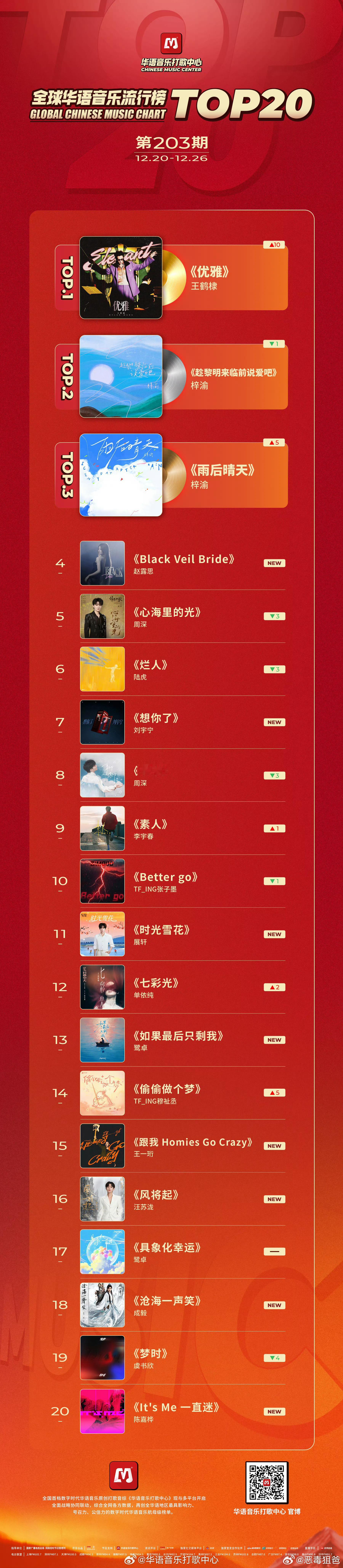 恭喜王鹤棣《优雅》在全球华语音乐流行榜众多流量中脱颖而出夺得桂冠。王鹤棣真的算是真正全能发展艺人。影视有男频爆剧《大奉打更人》女频现象级爆剧《苍兰诀》《流星花园》音乐方面有现象级爆曲《海边探戈》据今统计海边探戈全平台收藏量破766w➕ 跨年舞台也是连续三年b站播放第一