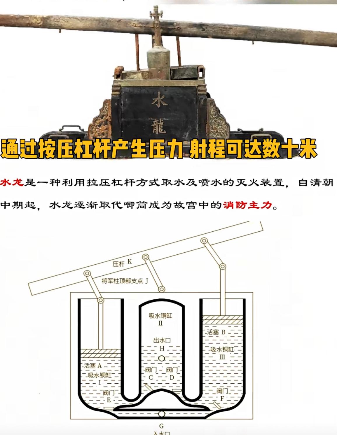 古人的灭火方式:宋朝有唧筒,还有观察火情的望火楼。明清有唧筒改进的水龙、水铳,看上去还挺不错的,在当时灭火效果也是杠杠的。 灭火器 灭火 灭火知识