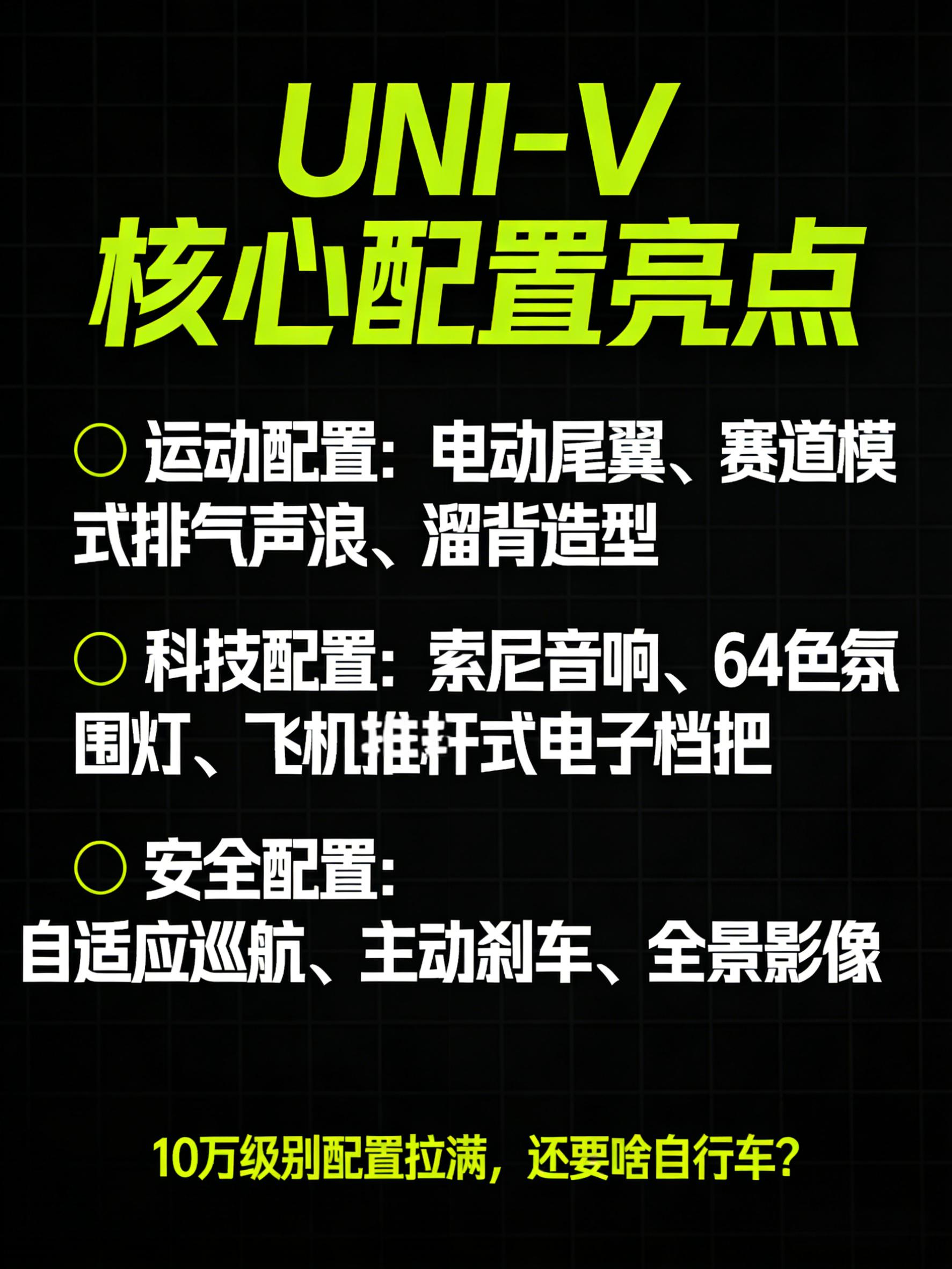 UNI-V主打运动属性,1.5T蓝鲸发动机+7速湿式双离合,188马力适配日常代步,零百7秒多;2.0T+爱信8AT版本233马力,零百6.5秒,赛道模式加持下质感拉满。配置层面,电动尾翼、索尼音响、64色氛围灯、主动刹车等均有配备,10万级就能拥有越级体验。