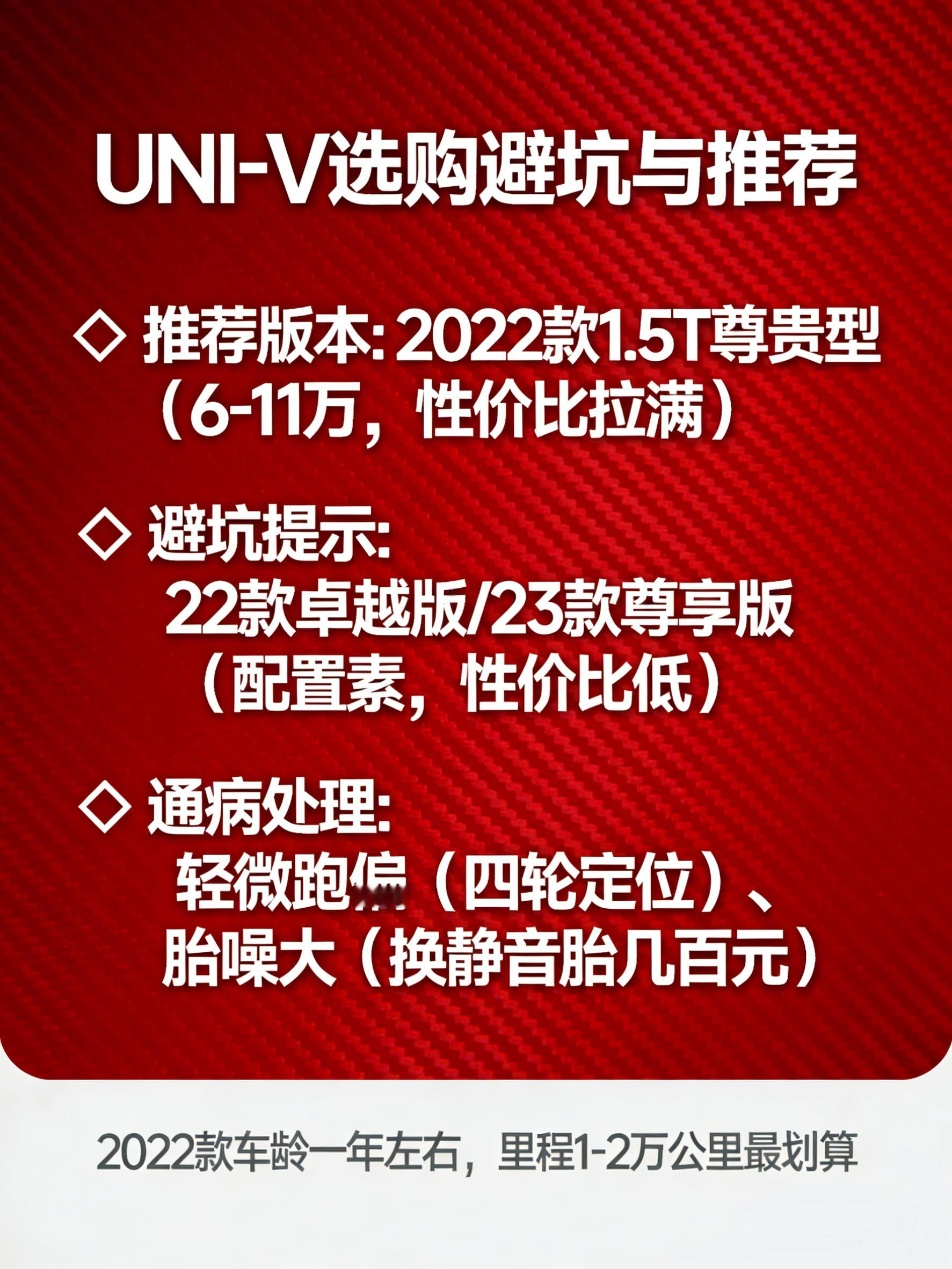 综上,2022款1.5T尊贵型是最优解,车龄短、里程低(多为1-2万公里),6-8万就能拿下,电动尾翼、全景影像等配置齐全,性价比拉满。预算有限选22款,追求新车质感选23-24款,入手二手UNI-V,花少钱就能解锁颜值与动力双在线的运动轿跑。【来自懂车帝车友圈】