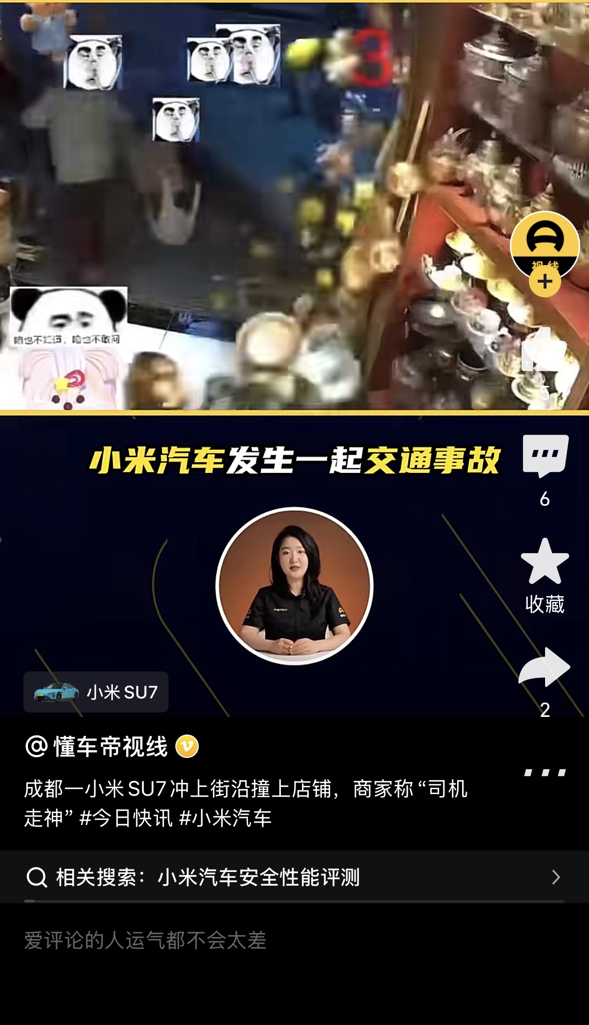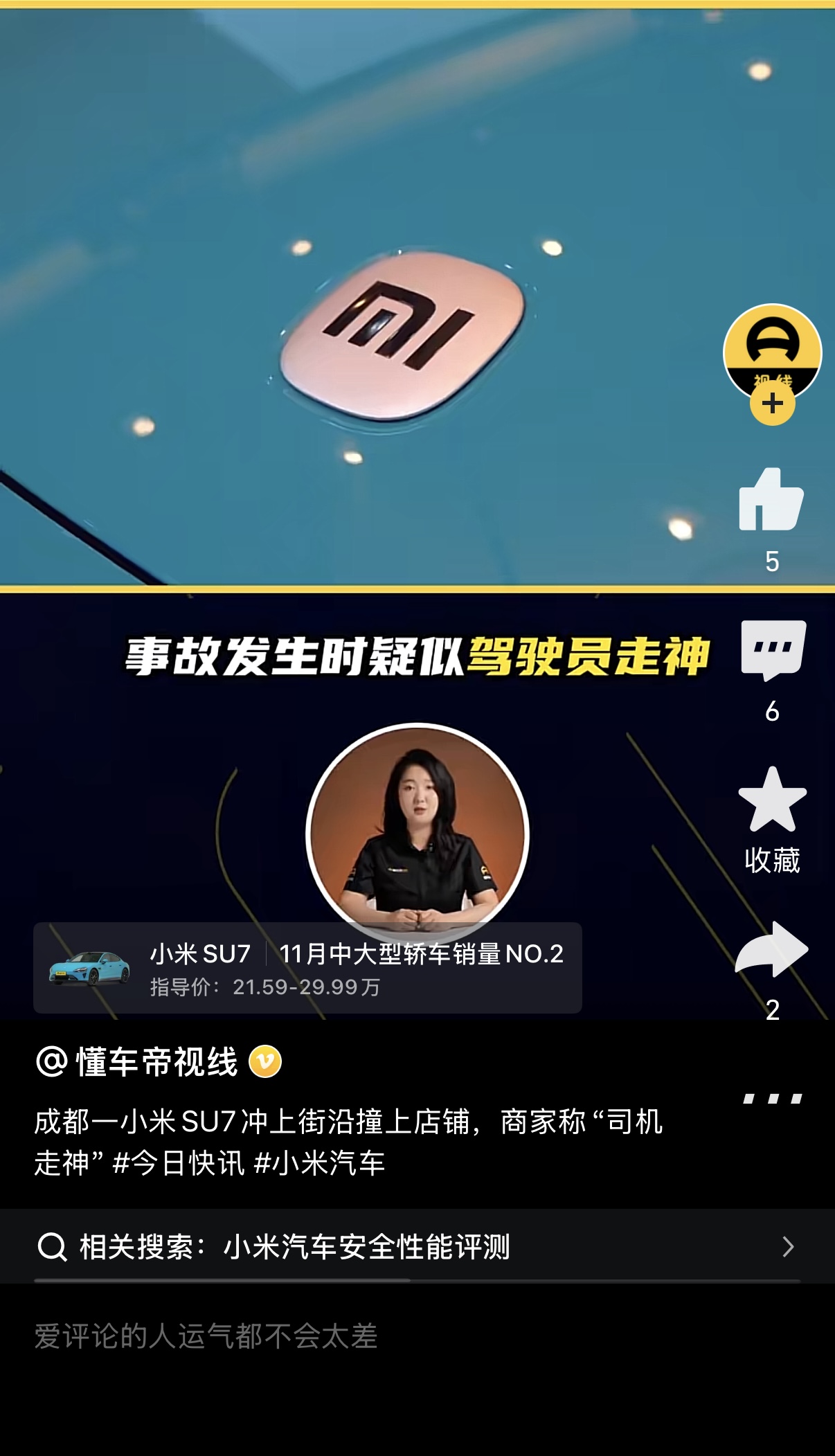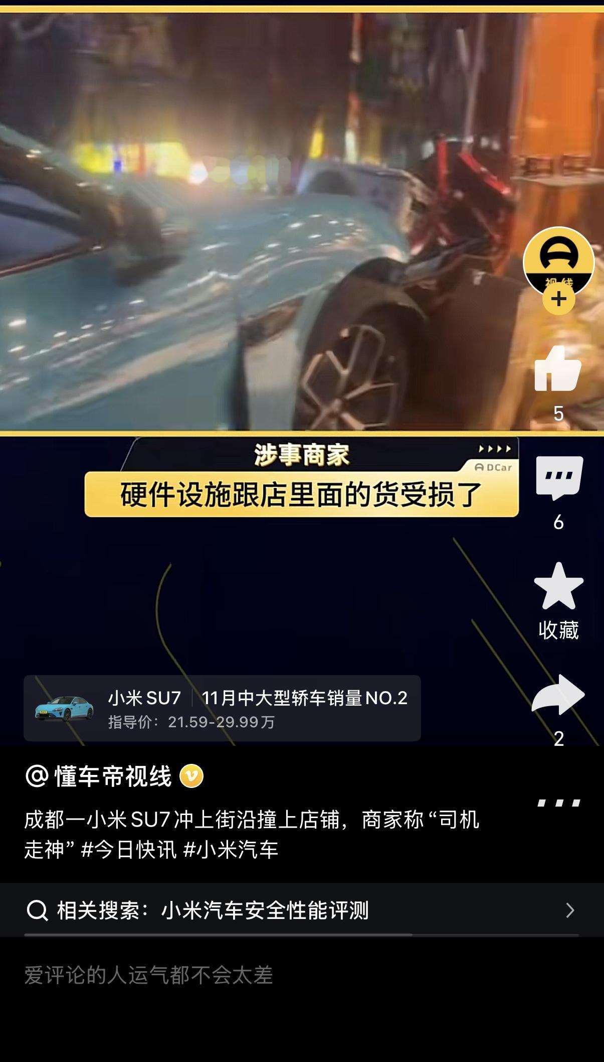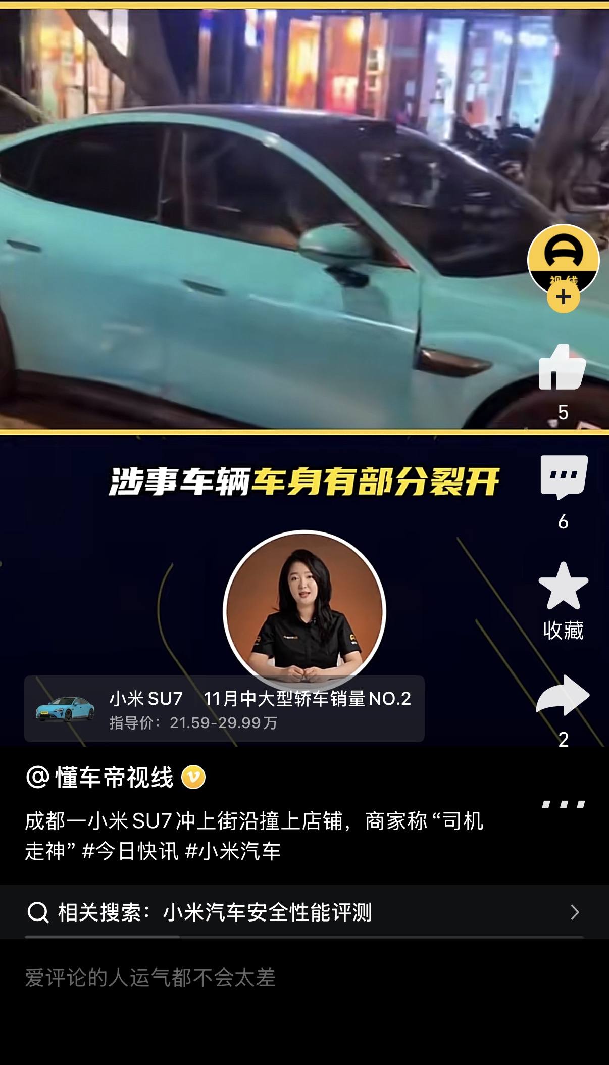 我认为从这件事本身来看,这起成都小米SU7冲上街沿撞店铺的事故,商家称是司机走神导致,其实这是典型的因驾驶员操作疏忽引发的交通事故,核心责任指向驾驶员个人行为,而不是车辆本身的质量或性能问题。
