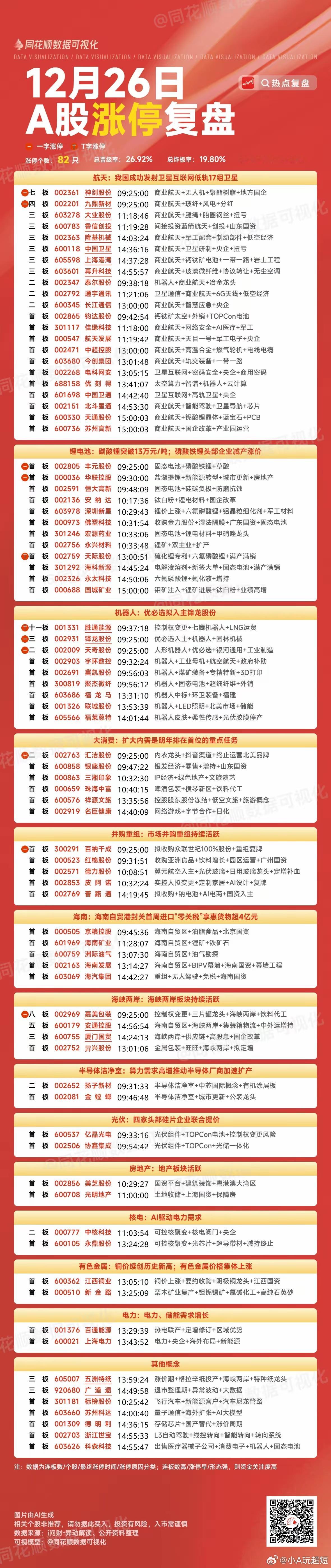 12月26日,今日涨停复盘(涨停82个),包括航天、锂电池、机器人、大消费、并购重组、海峡两岸等板块,航天和锂电池人气不减,市场情绪平稳。1、十一连板:胜通能源2、八连板:嘉美包装3、七连板:神剑股份4、五连板:安通控股5、四连板:九鼎新材6、三连板:中国卫星、上海港湾、锋龙股份、大业股份、鲁信创投、隆基机械、再升科技、五洲特纸等7、二连板:扬子新材、天奇股份、汇洁股份、泰尔股份、长江通信、中核科技8、首板:天际股份、百纳千成、华联控股、海汽集团、航天发展、北斗星通、福龙马、浙江世宝、中国卫通、德明利、苏州高新、深圳新星等