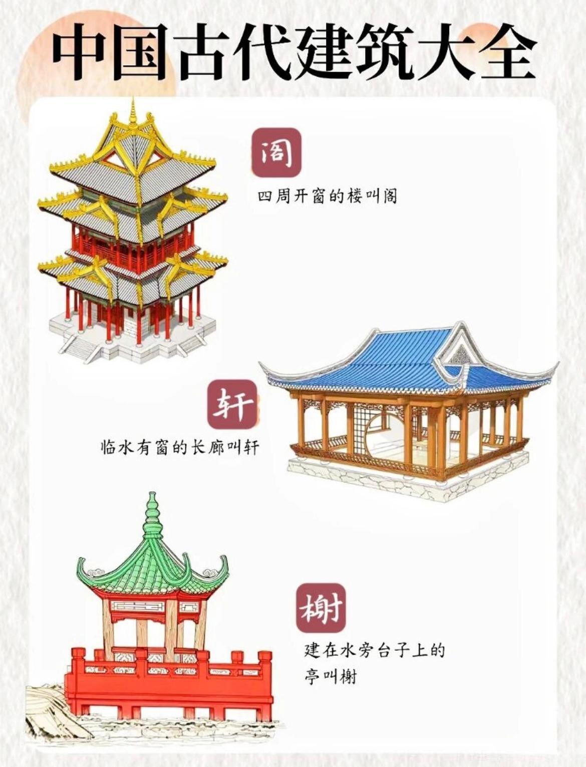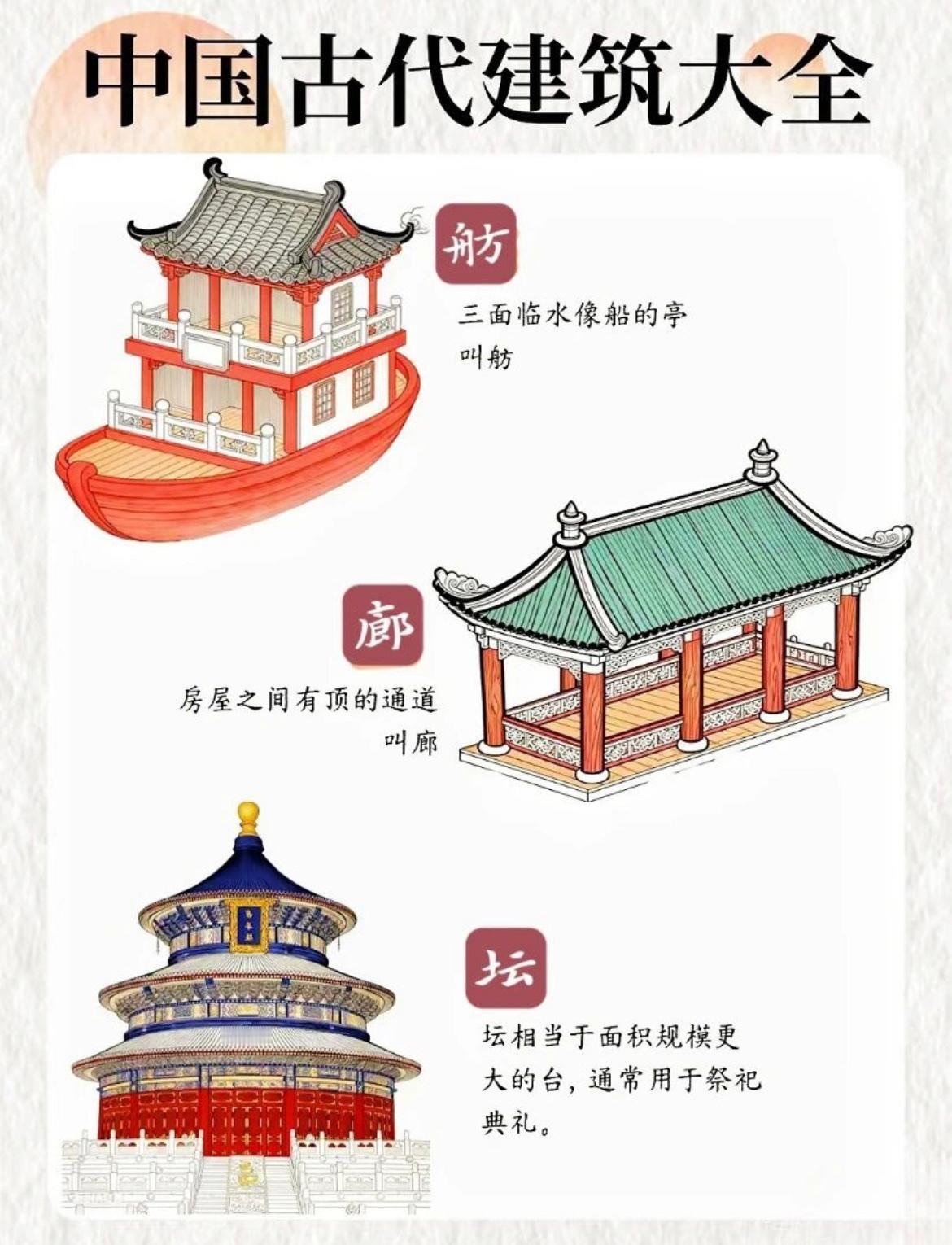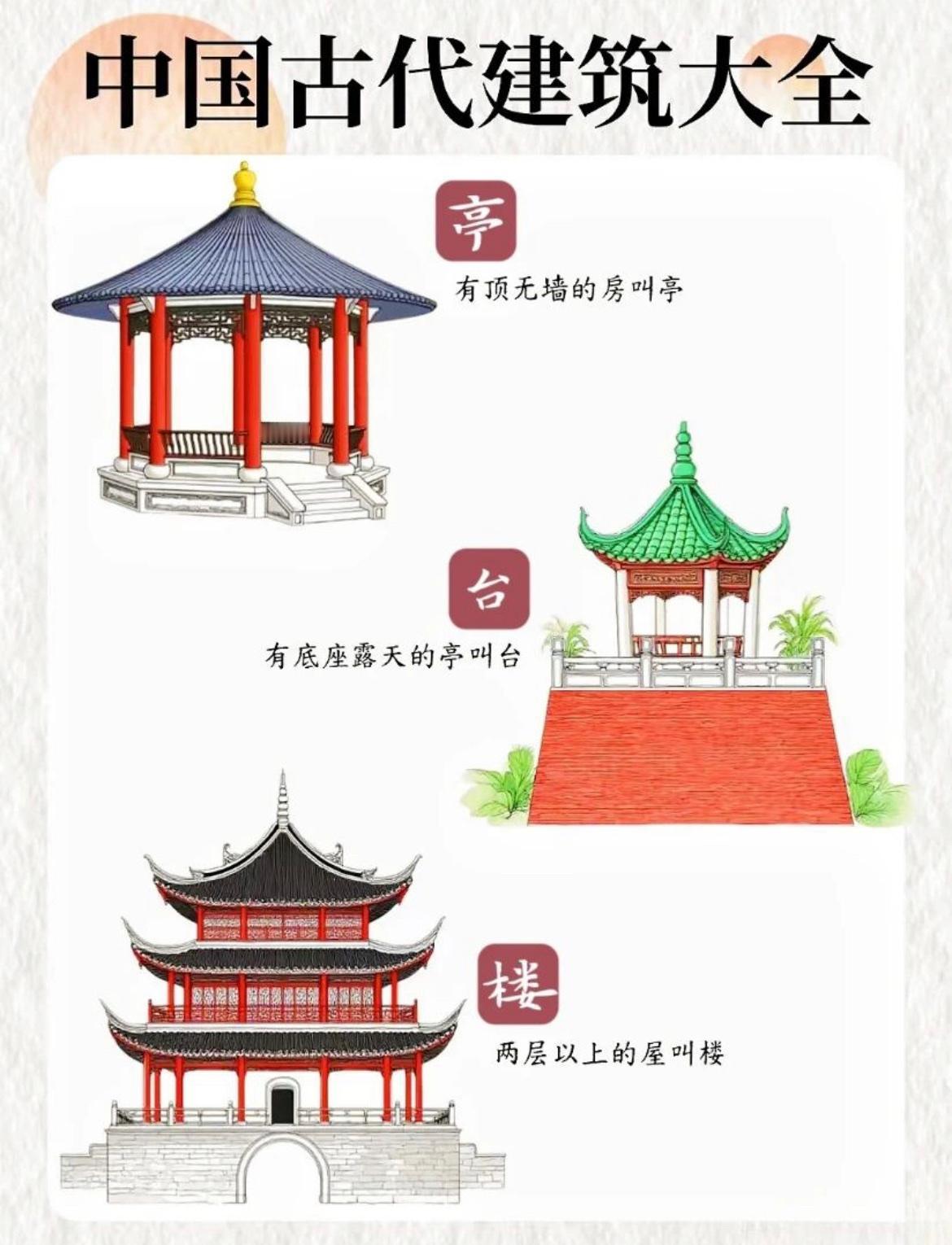 一张图了解中国古代建筑大全:亭、台、楼、阁、轩、榭、舫、廊、坛。 古建筑