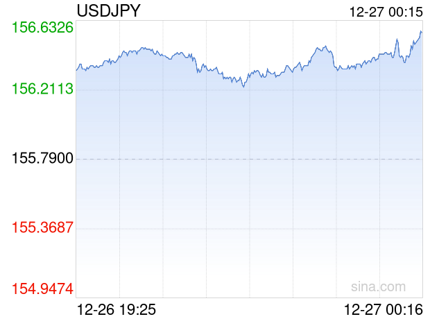 新浪外汇消息2025年12月27日,截至00时15分,外汇市场上美元兑日元汇率突破1美元兑换156.5700日元。涨幅为0.5007%