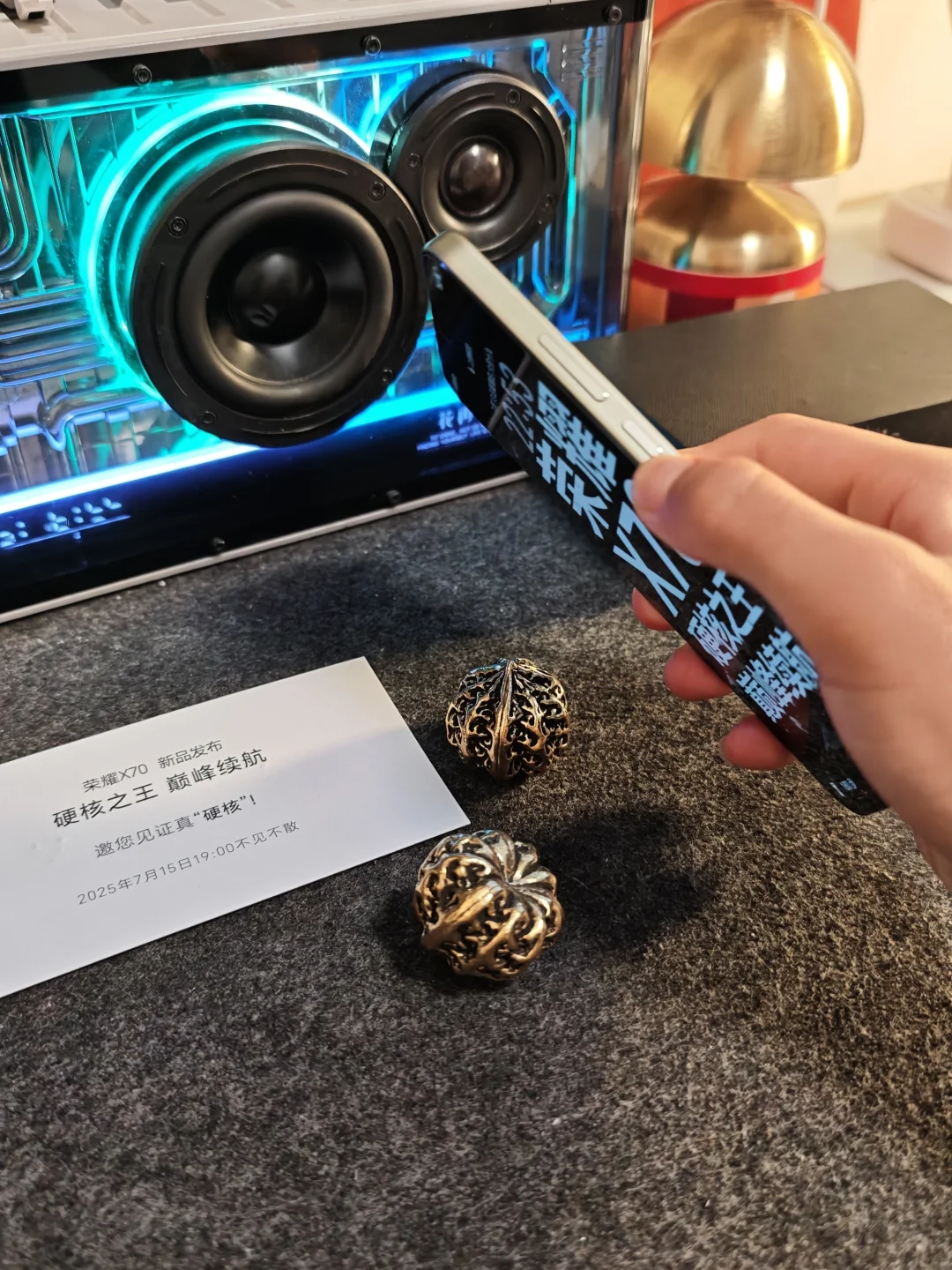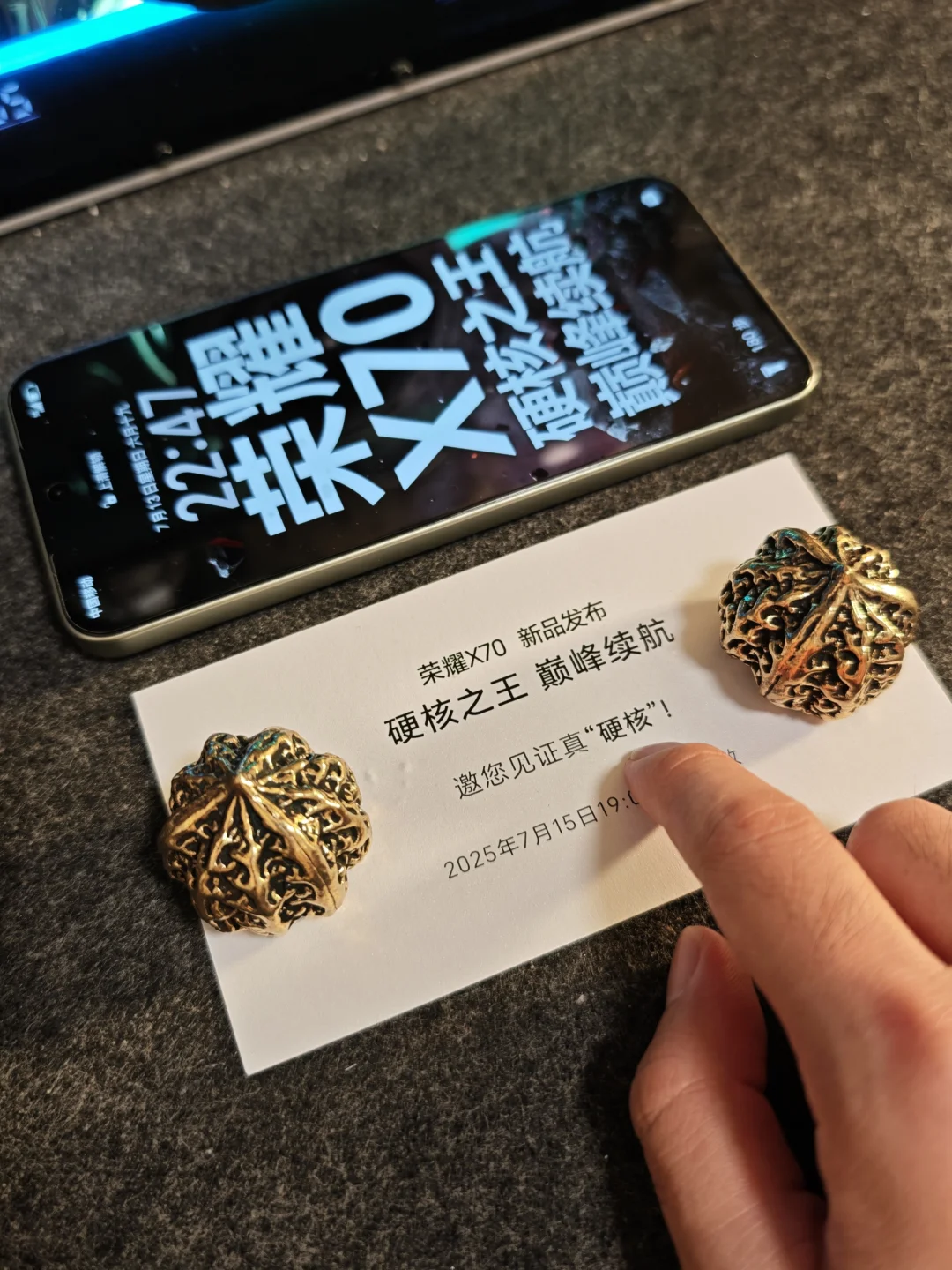 荣耀X70邀请函到了,听说很硬核,没想到盒子里真的是两颗“硬核”[笑哭R],纯金属核桃,邦邦硬,盘起来手感倒是很好~ 荣耀X70也是硬邦邦,行业最高规格防尘防水,IP66+IP68+IP69+IP69K,行业首个SGS金标十面抗摔,期待7/15正式发布!
