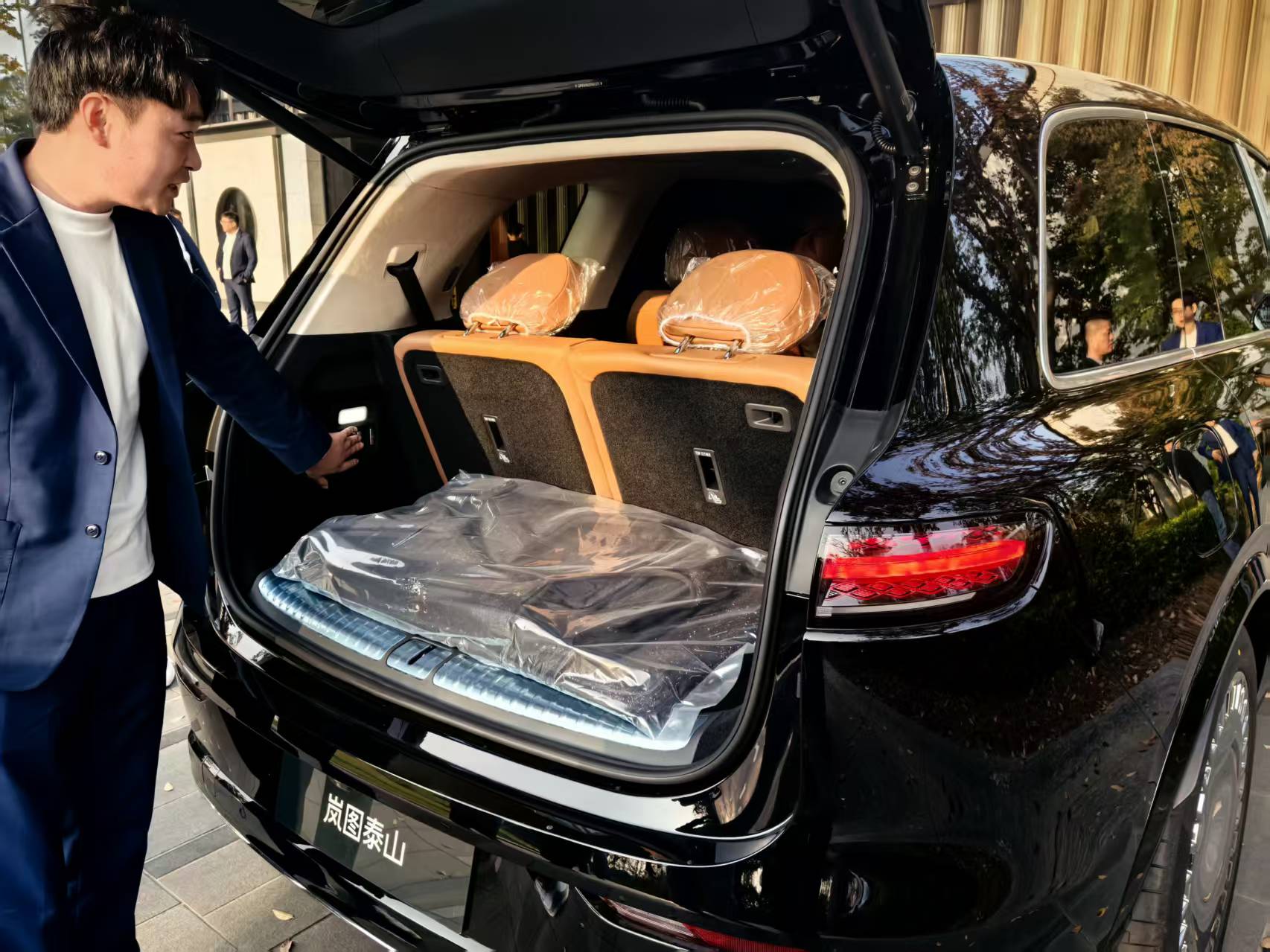 这段路坑洼密布,以往开其他SUV,颠簸感会直接传至座椅,水杯都不敢放。但泰山的三腔空悬像“智能缓冲垫”,滤掉了大部分颠簸,车身稳得惊人,我把手机放中控全程几乎没晃动。切换舒适模式后车身微升,过大坑洼时悬架回弹柔和,毫无生硬撞击感,销售笑道:“老人小孩坐后排也不会觉得颠。”