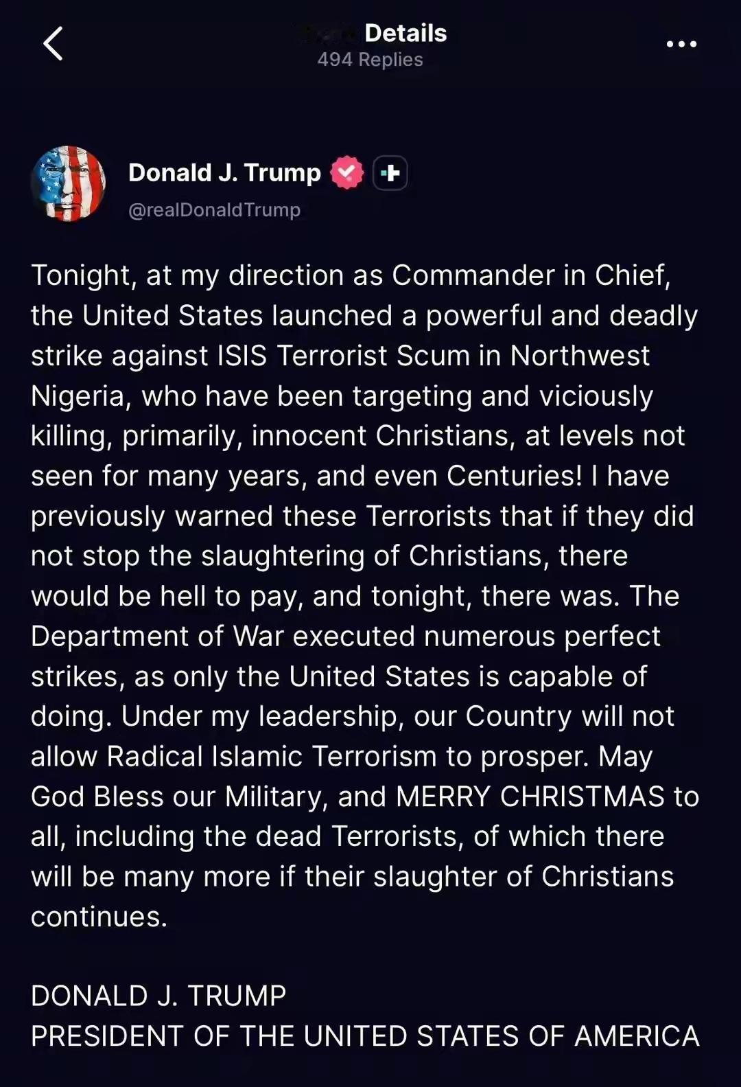 突发!美军圣诞夜动武!空袭尼日利亚,背后竟藏双重图谋? 没人能料到,2025年的圣诞夜会被枪声打破!美国总统特朗普直接下令,美军非洲司令部出动海军驱逐舰,发射"战斧"巡航导弹突袭尼日利亚西北部,目标直指所谓"伊斯兰国"恐怖分子,一场"斩首行动"骤然打响。 更让人意外的是,此前国际社会都在紧盯美军对委内瑞拉的军事部署,结果非洲大国尼日利亚突然成了焦点。要知道尼日利亚可不是软柿子——国土92万平方公里、人口2.27亿,军队早就推进现代化,70%的武器装备都是中国制造!JF-17"枭龙"战斗机能对空对海全能作战,"翼龙"无人机精准打击,VT-4坦克更是地面利器,真要正面硬刚,美军未必能占到便宜。 可尼日利亚外交部随后的声明耐人寻味:承认和美国有"安全合作",但强调是在"结构化框架"下推进。外媒一语道破真相:这是被美国逼的!特朗普之前指责尼政府"放任恐怖分子屠杀基督徒",一边威胁切断5.5亿美元援助,一边放话要"火力全开"军事干预,双重压力下只能被迫配合。 但明眼人都清楚,美军此举根本不是单纯反恐。尼日利亚坐拥丰富石油资源,而美国近年一直想掌控西非能源利益链;加上俄媒爆料,这是美军"重返非洲"的关键一步,核心是要削弱中俄在非洲日渐扩大的影响力。一边是资源掠夺,一边是地缘博弈,尼日利亚不过是大国角力的棋子。 圣诞夜本是和平时刻,美军却选择动武,背后的算盘昭然若揭。你觉得这场空袭会引发非洲局势动荡吗?中制武器能否成为尼日利亚的底气?美军空袭尼日利亚 中制武器 大国博弈