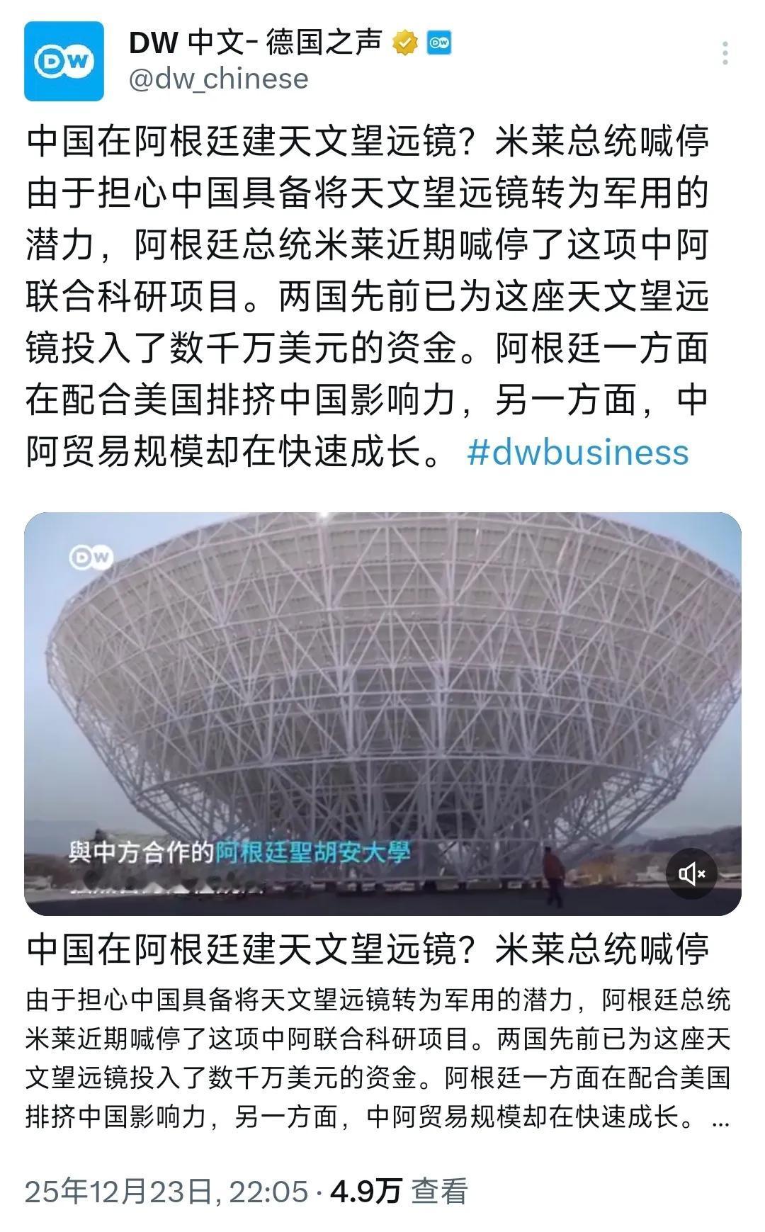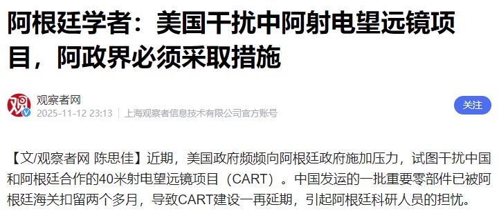 看来阿根廷的经济是缓了一口气,让米莱觉得我又行了。据报道,阿根廷总统米莱为讨好美国,以中阿合作的联合科研项目有转为军用的潜力,叫停了这座天文望远镜的建议,导致数千万美元的投入打水漂。 说起这个中阿合作的天文望远镜项目,它是两国酝酿多年的重点合作项目。早在2015年,中阿双方就达成合作共识,计划在阿根廷圣胡安省的埃尔莱昂西托地区建造一座40米口径的射电望远镜。 这个地区海拔高、晴天多、干扰少,是全球罕见的优质天文观测点,建成后不仅会成为南美洲最大的单口径毫米波射电望远镜,还能和中国的“天眼”联合形成跨越亚欧和拉美的深空观测网络,为研究恒星形成、黑洞等天文现象提供宝贵数据。 在项目推进的这十年间,中方投入了大量的技术、设备和资金,核心部件都已运抵阿根廷,阿方则负责提供场地和基础建设支持。到今年年中,项目主体结构基本完工,进度已经推进到七成以上,原本计划2026年3月就能投入科研试运行。 参与项目的阿根廷科学家更是满心期待,毕竟这个项目不仅能提升阿根廷的天文科研水平,还能培养一批本土科研人才,甚至能带动当地的就业和经济发展。可谁也没想到,米莱政府一纸行政令,就让这一切戛然而止。 米莱给出的叫停理由完全站不住脚,他声称项目“有转为军用的潜力”,但稍微懂点科学常识的人都知道,射电望远镜的工作原理是接收宇宙自然电磁波,根本没有信号发射器,连最基本的追踪卫星、导弹的功能都不具备,所谓的“军用潜力”纯属无稽之谈。 更讽刺的是,阿根廷境内早就有美国、欧洲等国家建设的同类天文观测设施,这些设施从未被要求进行所谓的“安全复审”,唯独中阿合作的项目被贴上“高风险”标签,这种双重标准背后的心思,明眼人都能看穿。 米莱叫停项目的真实目的,无非是为了讨好美国。而就在项目叫停前后,米莱政府正加紧向美国靠拢,美国也趁机抛出了200亿美元“经济援助”的诱饵,条件之一就是让阿根廷“重新评估与中国在敏感技术领域的合作”。 而米莱的这一决定,已经引发了阿根廷国内的强烈反弹。圣胡安天文台的主任公开抗议,认为这是在扼杀本土的科研发展;不少参与项目的科学家更是痛心疾首,他们付出了多年的心血,眼看项目就要完工,却被一纸命令叫停,连工地都进不去了。 更关键的是,项目的停摆不仅造成了巨额的经济损失,还让阿根廷在国际科研合作领域丢了信誉,以后再想和其他国家开展深度科技合作,恐怕都会面临信任危机。 科学本应超越国界,服务于全人类的探索事业,可米莱却把一个纯粹的科研项目当成了地缘政治博弈的工具。一座本该凝望星空的望远镜,硬生生被他变成了讨好美国的“筹码”,数千万美元的投入打了水漂,阿根廷的科研发展也被按下了暂停键。 米莱或许觉得靠向美国就能让阿根廷经济缓过来,但这种牺牲国家主权和长远利益的做法,注定无法从根本上解决问题,反而会让阿根廷在错误的道路上越走越远。