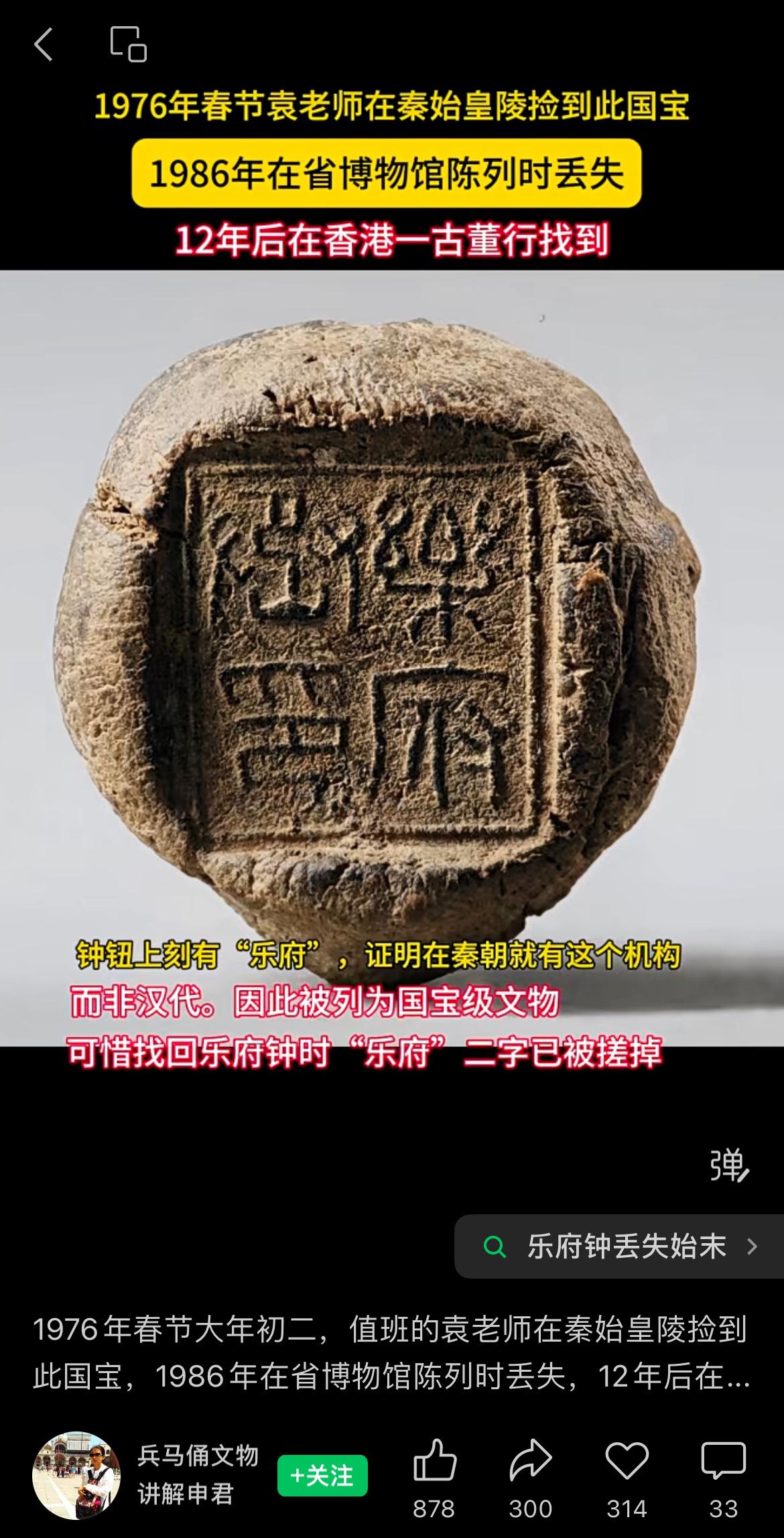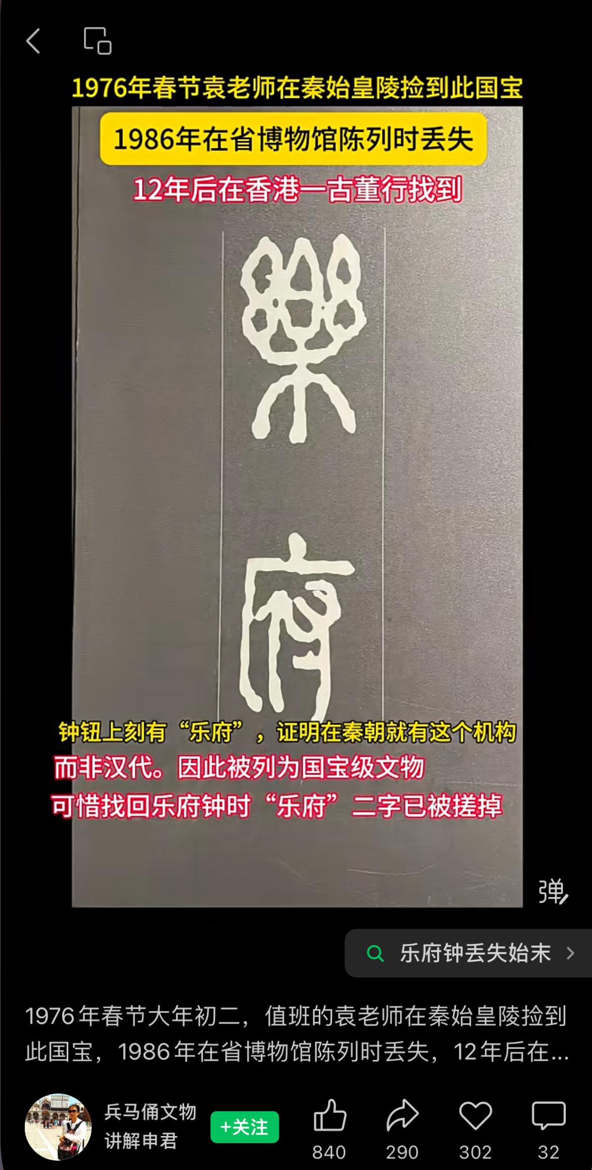1976年春节大年初二,值班的袁老师在秦始皇陵捡到国宝乐府钟,1986年在省博物馆陈列时丢失,12年后在香港一古董行找到,香港友人捐赠乐府钟后藏于兵马俑博物馆。 钟钮上刻有”乐府“二字,证明在秦代就有乐府这个机构而非汉代,因此被列为国宝级文物! 可惜找回乐府钟时”乐府“二字已被搓掉。