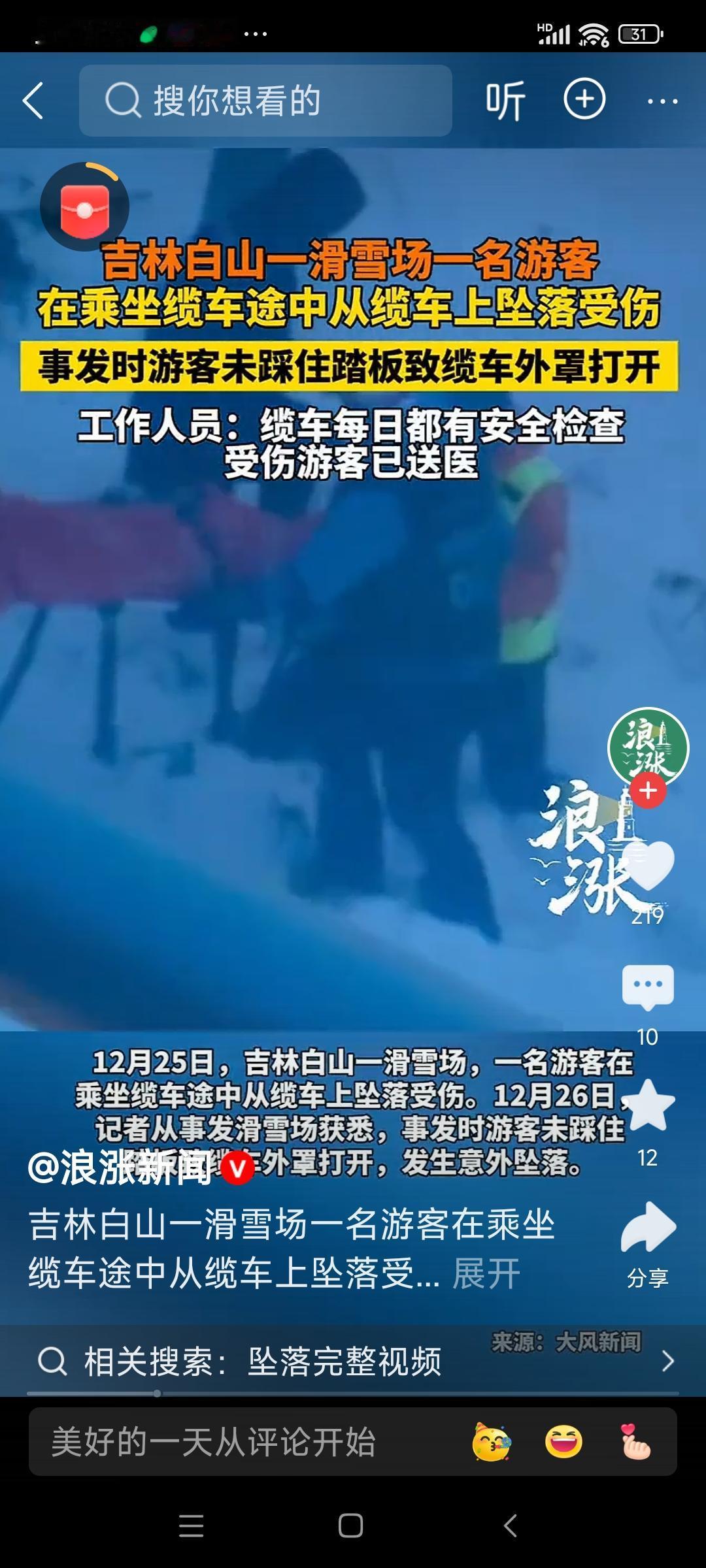 震惊!白山滑雪场惊现“空中坠落”惨剧,游客瞬间变“空中飞人”!事发细节曝光,安全隐患引发热议! (来源:中国新闻网) 你是否曾梦想在雪白世界中自由驰骋?然而,一场突如其来的意外,却让一切美好瞬间变成噩梦。12月25日,吉林白山一著名滑雪场发生令人震惊的“空中坠落”事件,一名游客在乘坐缆车时意外从空中跌落,生命悬于一线。这起事件不仅让现场气氛瞬间凝重,也引发了公众对滑雪场安全管理的广泛关注。 事情发生在一个寒冷的冬日午后。白山滑雪场迎来了众多滑雪爱好者,空气中弥漫着雪花飞舞的清新气息。游客们或在雪地上飞驰,或在缆车中欣赏雪山美景。然而,就在一切看似平静之时,一名年轻游客在乘坐缆车时突然发生了意外。 据现场目击者描述,事发时这名游客似乎没有踩稳缆车上的踏板,导致缆车外罩突然打开,游客瞬间从空中坠落。据悉,事故发生后,现场立即启动应急救援,医护人员迅速赶到,将受伤游客送往医院救治。 白山滑雪场方面表示,缆车每天都进行严格的安全检查,确保设备正常运行。工作人员还强调,受伤游客已投保,使用实名制雪卡,工作人员会协助处理后续的医药费用。 然而,事故的发生也引发了公众的热议。有网友质疑:“是不是设备本身存在安全隐患?还是游客在操作时不够小心?”一些业内人士指出,缆车作为高风险交通工具,安全措施必须到位,尤其是在冬季雪景吸引大量游客的情况下,更应加强安全监管。 事发后,白山滑雪场迅速作出回应,表示会全面排查安全隐患,并加强对游客的安全提醒。他们还承诺,将配合相关部门进行调查,确保类似事件不再发生。 值得注意的是,事故现场的视频在网络上流传开来,画面中可以看到缆车外罩突然打开,游客在空中挣扎的瞬间令人揪心。这也让许多网友对滑雪场的安全措施提出了质疑,呼吁相关部门加强监管,保障游客的生命安全。 近年来,随着冬季旅游的兴起,滑雪场成为众多家庭和年轻人的首选休闲方式。然而,频繁发生的安全事故也让人们开始反思:这些场所是否真正落实了安全责任? 从这次白山滑雪场的事件可以看出,安全管理的漏洞可能带来无法预估的巨大风险。设备维护、操作规范、应急预案……每一个环节都关系到游客的生命安全。公众期待,相关部门和企业能够从中吸取教训,提升安全水平,确保每一位游客都能在雪地中安全畅玩。 这起事件再次提醒我们,冬季旅游虽美好,但安全永远是第一位。你是否曾在滑雪或其他极限运动中遇到过安全隐患?你认为滑雪场应该采取哪些措施来保障游客安全?欢迎在评论区分享你的看法! 同时,也希望相关部门加强监管,督促滑雪场落实安全责任,让我们在雪地中享受快乐的同时,也能平安归来。 每一次意外都在提醒我们:安全无小事。无论是滑雪、登山还是其他极限运动,安全措施都应成为第一优先。希望这次白山滑雪场的事件能引起行业的深刻反思,也希望每一位热爱冬季运动的朋友都能时刻牢记安全第一,让我们的冬天既精彩又平安。 如果你也关心旅游安全,或者有过类似经历,欢迎在评论区留言分享你的故事!别忘了点赞、转发,让更多人关注冬季旅游安全,共同守护我们的美好冬天! 滑雪场安全分析 吉林冰面事故
