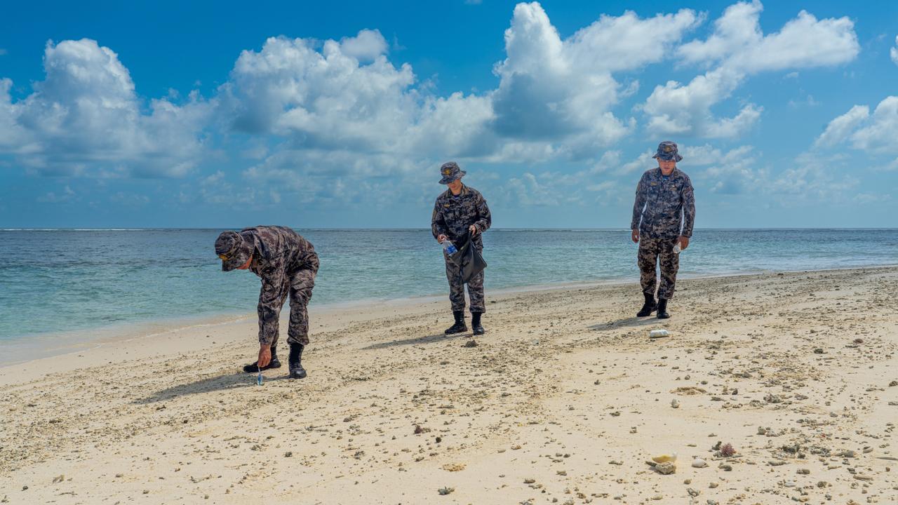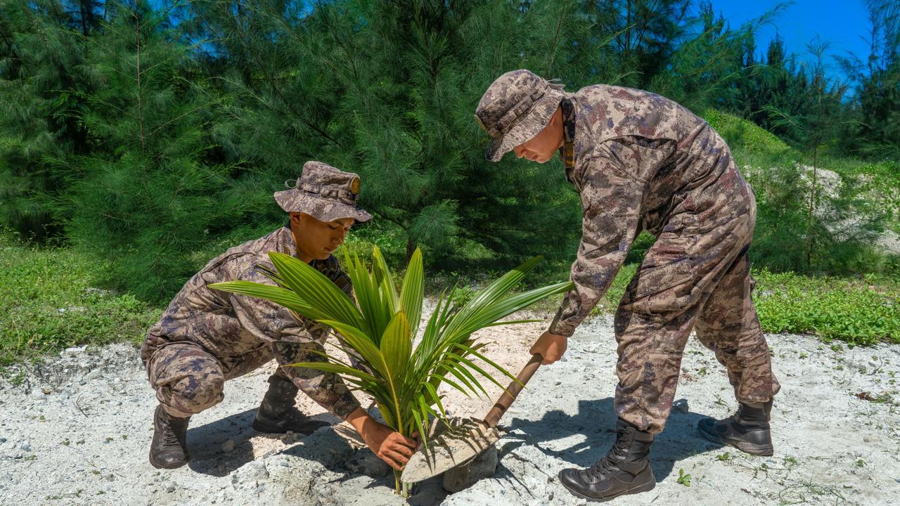 据说是新型的21式岛礁迷彩服,看上去伪装效果挺不错的,比之前的“蓝精灵”好多了(参见图3~4)。当年据杨南振大校说,中国海军陆战队的“蓝精灵”迷彩是经过详细论证和严格测试的,视觉伪装效果和防红外功能都挺不错,因此才列装。不过,估计他说的是在水线滩头那时候伪装效果好,一旦上岸就有点格格不入了~
