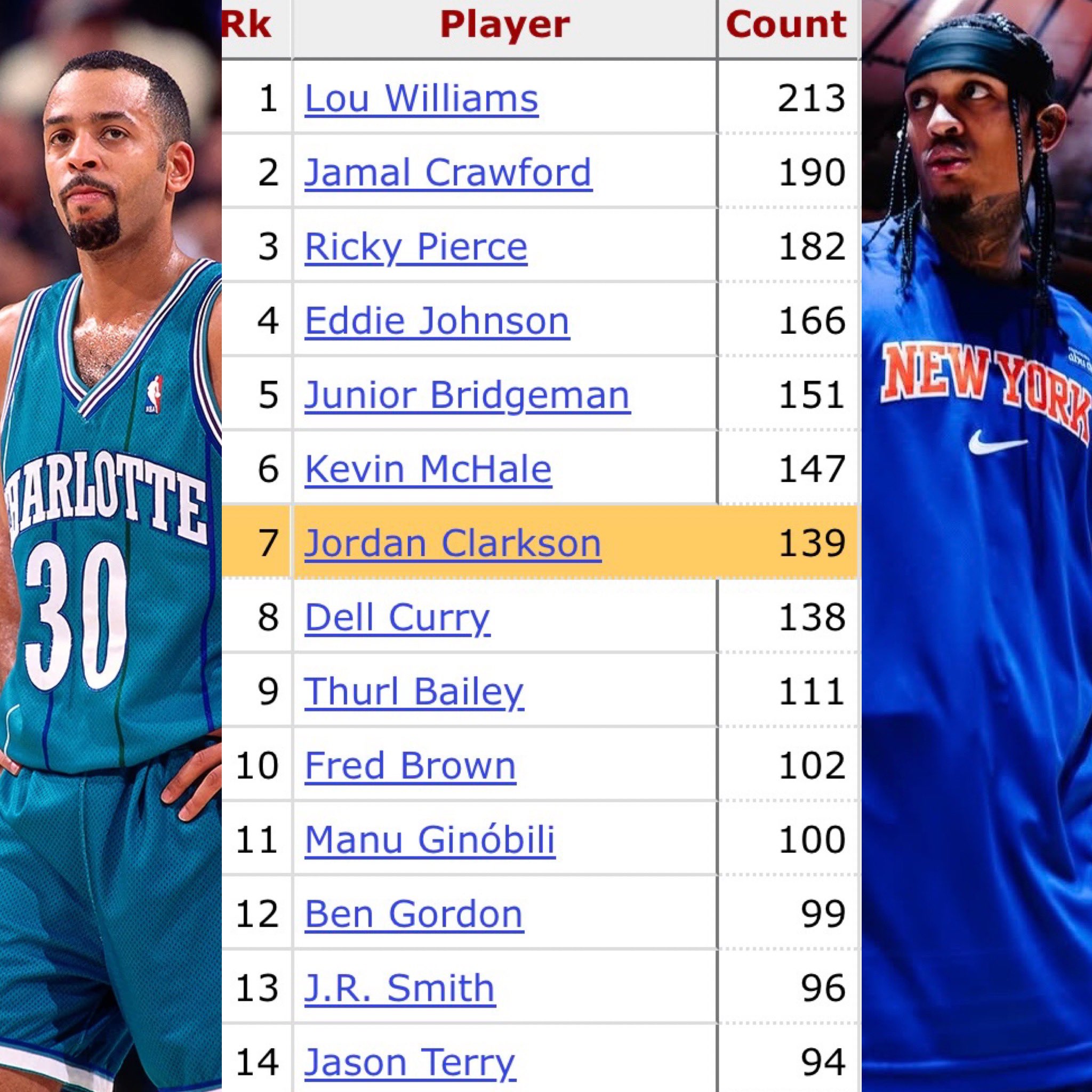 截至目前,克拉克森职业生涯已有139次以替补身份出战得到20分以上。