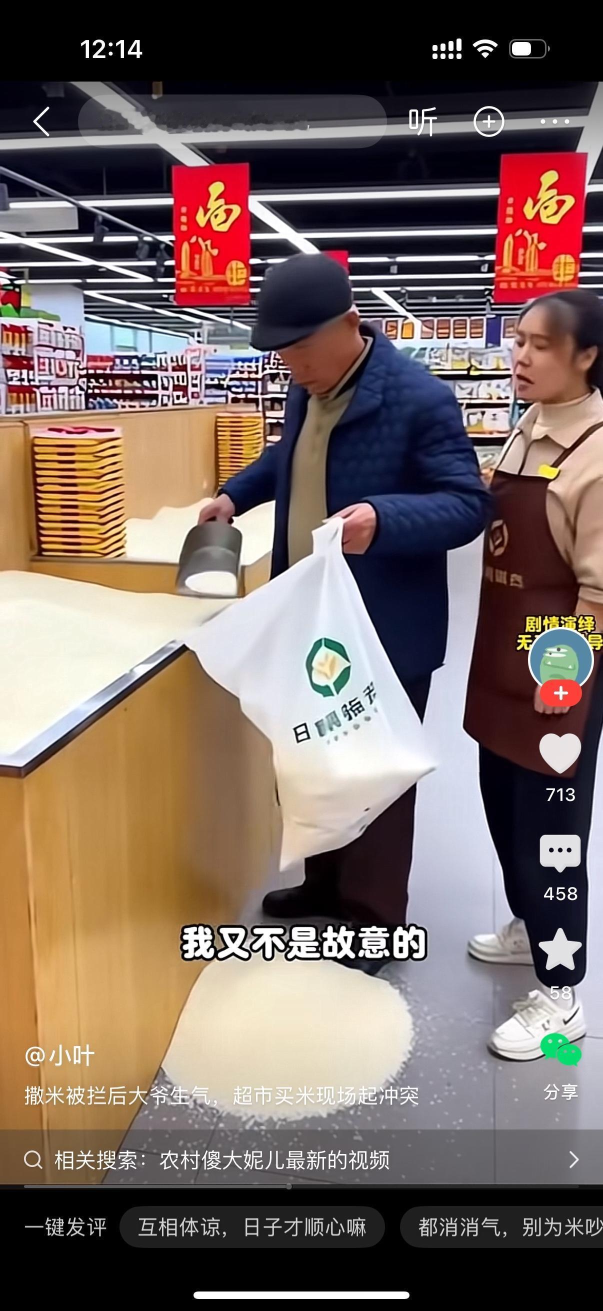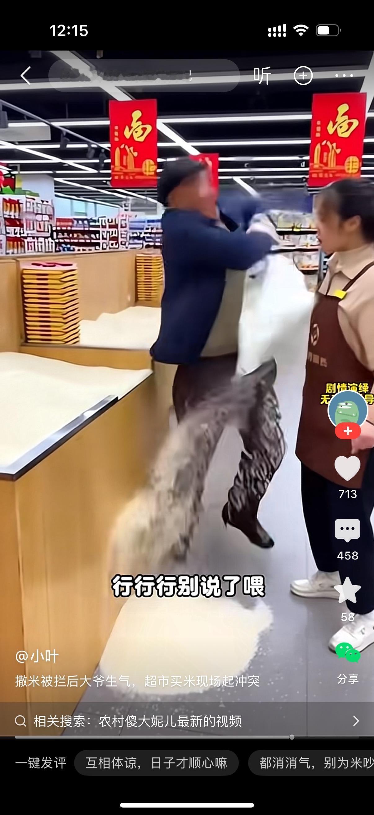 大爷在米箱处盛米,把米洒落一地。导购员跑过来大喊,大爷,您倒在这干嘛?大爷回怼,我又不是故意的,说着又把米倒在地上。导购员急了,哎呀,这是粮食啊,太浪费了。大爷却说,你待会扫一下就可以了啊。导购员嘟囔,真没素质。大爷火大了,直接把装米的袋子扔在地上,说我不买了。为老不尊说的就是这种人吧。