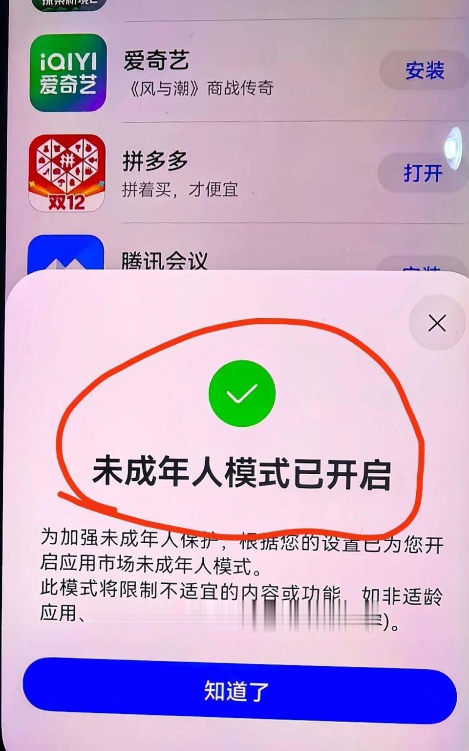 以华为应用市场为例,打开时弹窗提示显示“未成年人模式已开启,此模式将限制不适宜的内容和功能”,内容方面只展示与账号年龄相符的应用;功能方面会隐藏营销活动、心愿单等功能;对于不适龄的应用,也不可点击“安装”。“鸿蒙有礼”属于营销活动,涉及红包金额,并不适合未成年人参与,因此,孙先生在使用未成年人账号参与时会受到限制。