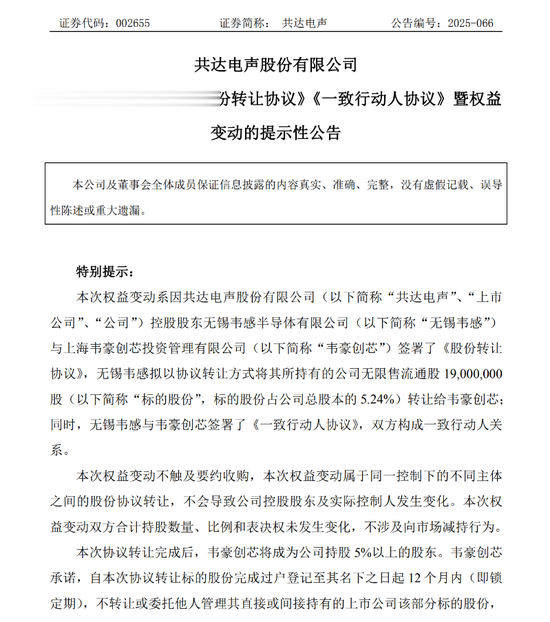 共达电声表示,此次权益变动属于同一控制下的不同主体之间的股份协议转让,不会导致公司控股股东及实控人发生变化。
