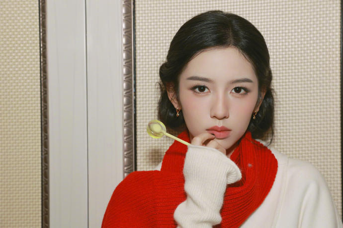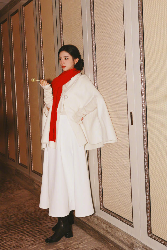 周也今日出席线下活动造型,身着毛呢斗篷外套、针织衫及半身长裙,搭配红色围巾和袖套,把PANTONE 2026年度代表色穿在身上,温柔贵气感爆棚