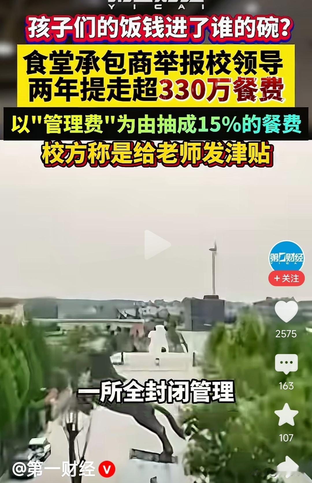 这个学校的领导真能搜刮学生的伙食费,孩子的饭钱两年拿走了330万。 河南淮阳中学是一所封闭式学校,学校有3000多名学生,学校收取每人每天20元,学校领导以管理费为由,从承包商抽取孩子们的吃饭费15%,这个学校的领导两年拿走330万学生的吃饭钱。 学校封闭式管理,学生都在学校吃饭,孩子都在长身体的年龄,把孩子吃饭钱挪走,这是什么样的领导,心中还有学生吗?他们是你的提款机吗? 两年拿走330万,这可不是小数目,把学校的食堂当成什么。 很多学校把食堂包给外面有资质的人做饭,这样也好,能保证学生每天都能吃上新鲜干净的饭菜。 还真有些商人和学校领导勾结在一起,克扣学生的伙食费,或者挪用学生的饭钱。 学生是国家的未来,是长身体的时候,希望每个学生都能吃好。