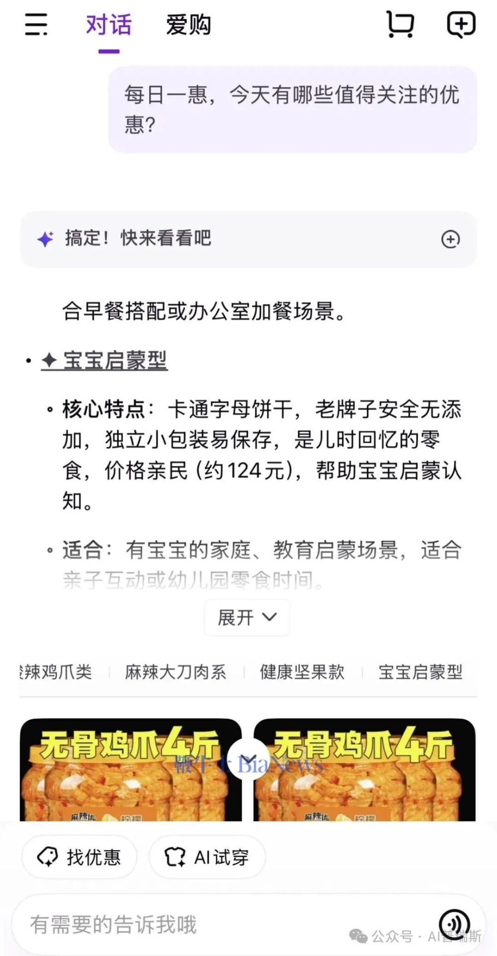 我试着问了一句“每日一惠,今天有哪些值得关注的优惠?”,AI反应很快,立马甩出了几组不同品类的推荐。