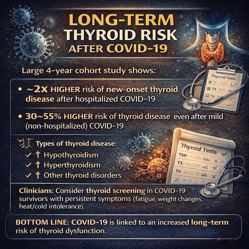 一项大型队列,观察4.5年的研究表明,新冠感染与新发甲状腺疾病风险升高相关。来自美国某医疗系统超过57万名患者,分为4个组,分别是:✨新冠感染没有住院的轻症组。✨新冠感染住院组。✨新冠阴性组。✨以及新冠没有出现时候的历史对照组(2016 年 ~ 2019 年 )。随访观察长达4.5年。结果,发现:✨新冠轻症组,甲状腺疾病风险高出33%~55%;✨新冠住院组,甲状腺疾病风险高出2倍。受影响的甲状腺疾病类型:甲状腺功能减退症、甲状腺功能亢进症,和其他/未明确的甲状腺疾病结论:无论轻症还是住院,新冠感染后与新发甲状腺疾病的风险增加相关。新冠康复者,加强甲状腺功能障碍筛查可能是必要的。参考:网页链接