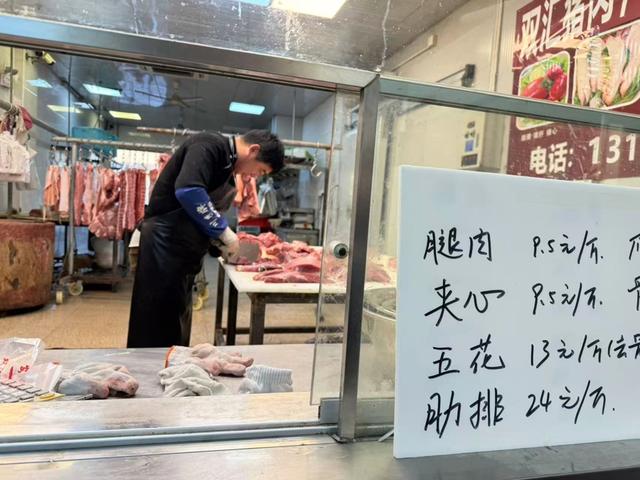 批零兼营的猪肉摊主王成义介绍:“店里每日销量50至60头猪,今天腿肉9.5元/斤、去骨五花肉13元/斤、肋排24元/斤,价格保持平稳。”