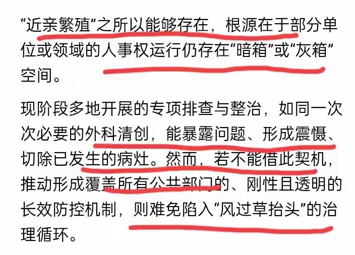 关于的“近亲繁殖”的问题, 可以说已经是公开的秘密了吧,大家从身边无数的例子都很容易就可以看到。为什么现在官方媒体要亲自下场来这个事情呢? 根本原因就是整治体制内的近亲繁殖,已经是到了刻不容缓的地步!两个体制内不同单位的好朋友,我家的孩子毕业后去你那里,你家的孩子毕业后去我家里,这样的操作屡见不鲜。就已经不是单单公平的问题了。 人情岗和世袭岗的存在,导致了一个岗位几代人的情况真的是太多了。我们一直以为的有能力者上,在现实面前比不上一句“打个招呼”!