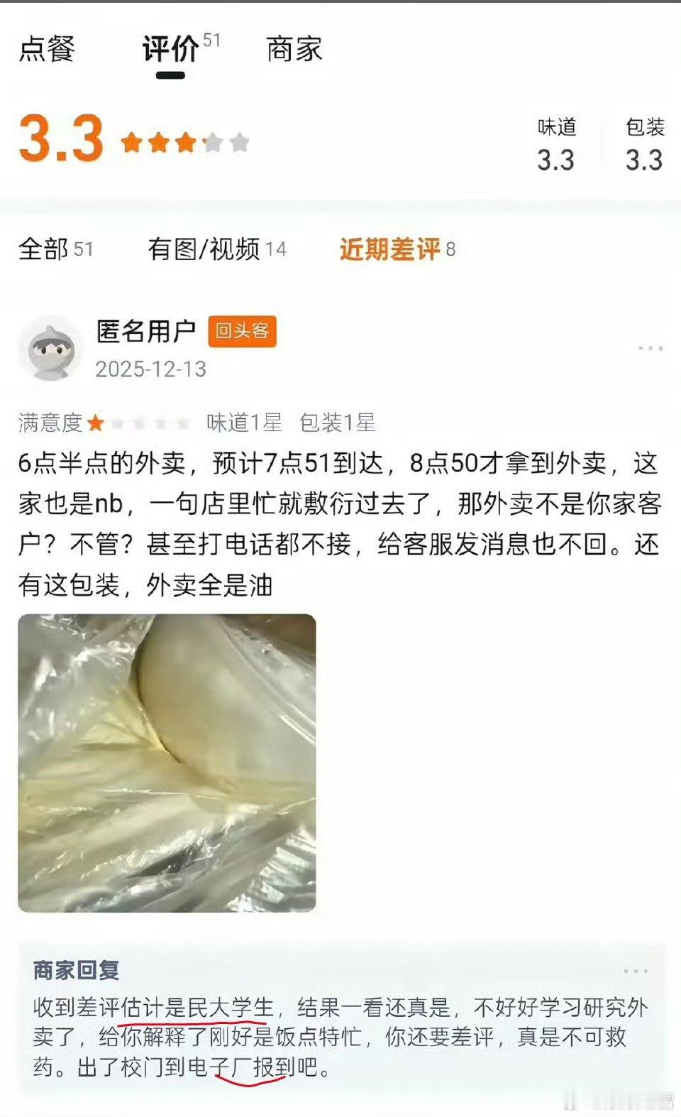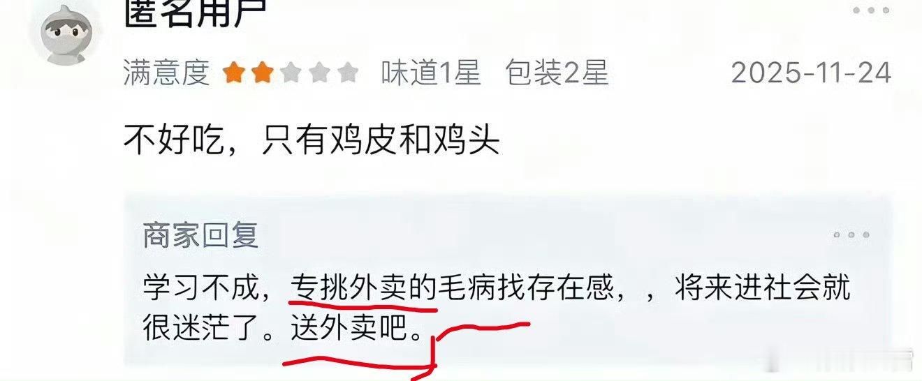 兰州这家大盘鸡店的操作真是既愚蠢又伤人,活该被网友们集体抵制。做生意讲究和气生财,顾客给差评确实有时很委屈,但哪怕有分歧也该理性沟通,怎么能张口就嘲讽学生“学历低”,还恶意揣测人家“毕业后只能送外卖、进电子厂”?且不说职业没有高低贵贱,送外卖、进电子厂都是靠劳动吃饭的正当职业,凭什么被拿来当侮辱人的话?更别说学生群体本就是高校周边商家的核心客群,这样贬低自己的衣食父母,简直是砸自己的饭碗。学生们花自己的钱消费,有权对服务和菜品提出意见,这种权利不该被商家的傲慢和偏见践踏。职业歧视从来都是社会公敌,每个靠双手打拼的人都该被尊重,无论是刚走出校门的学生,还是奔波在大街小巷的外卖员、坚守在车间的工人,他们的劳动都值得被善待。涉事商家不仅不反思自己的问题,还拒绝道歉,甚至解约后还辱骂品牌总部,这种嚣张态度就不该干餐饮。好在品牌总部及时止损,解除合作并责令摘牌。这件事也给所有商家提了个醒:生意要想做得长久,诚信经营是根本,尊重顾客是底线。不懂得尊重他人、漠视社会公序良俗的商家,迟早会被市场淘汰。