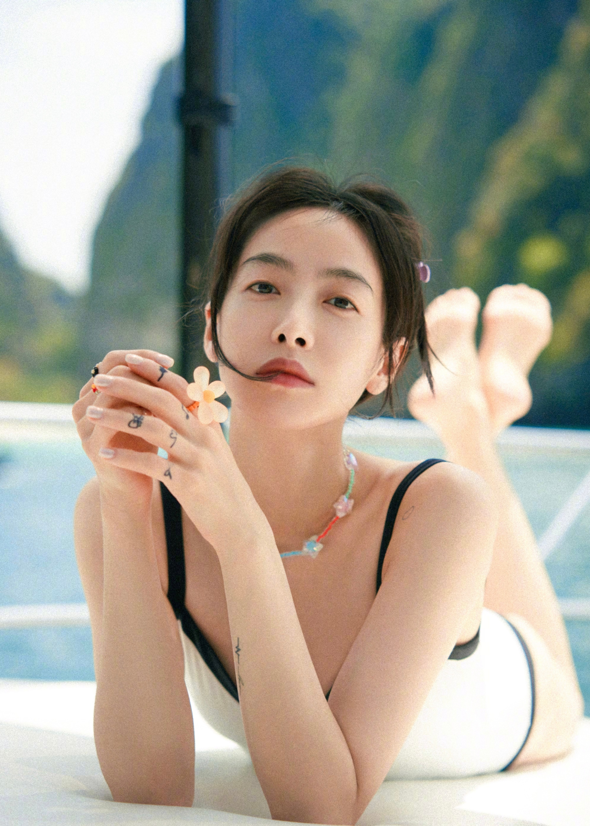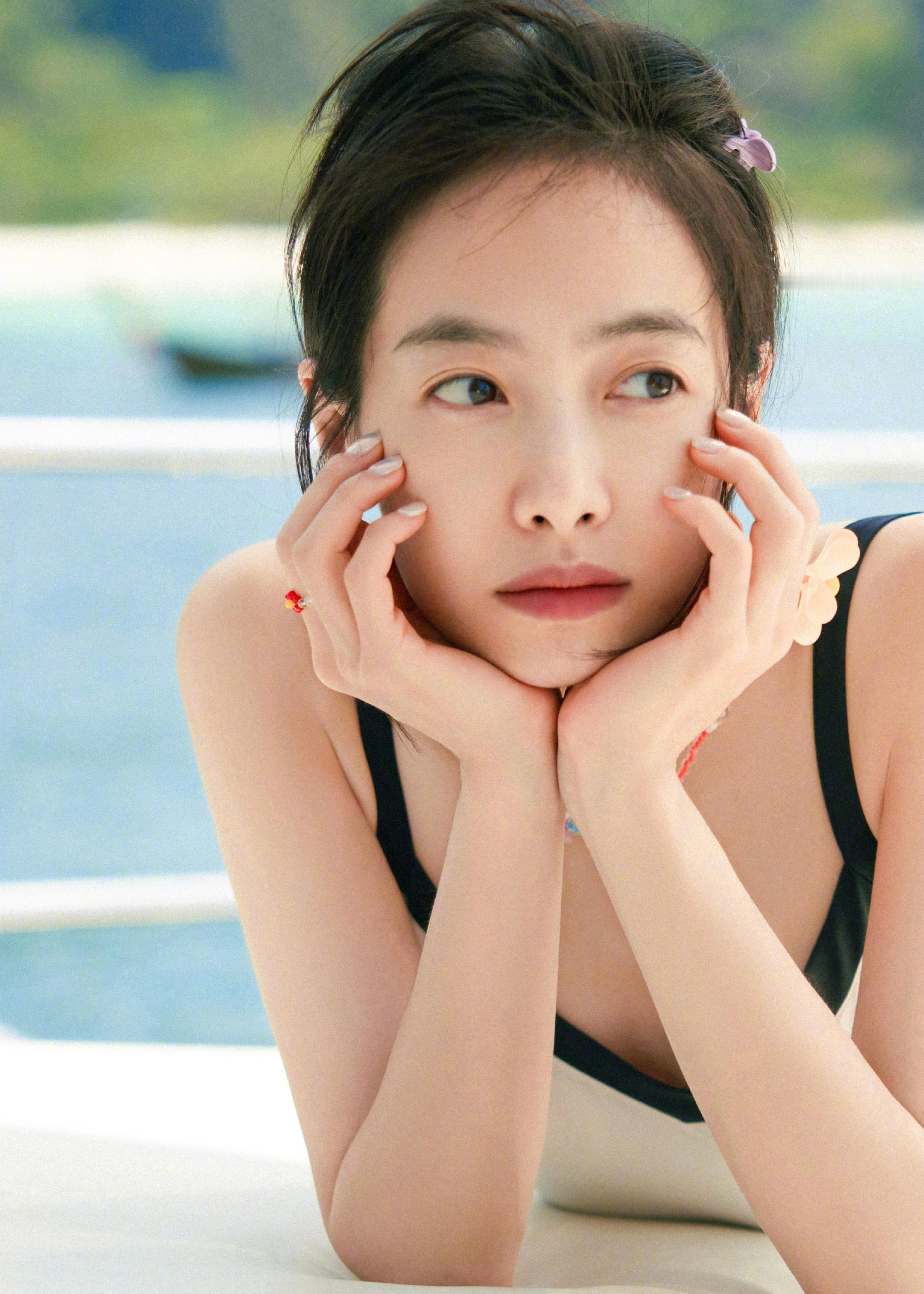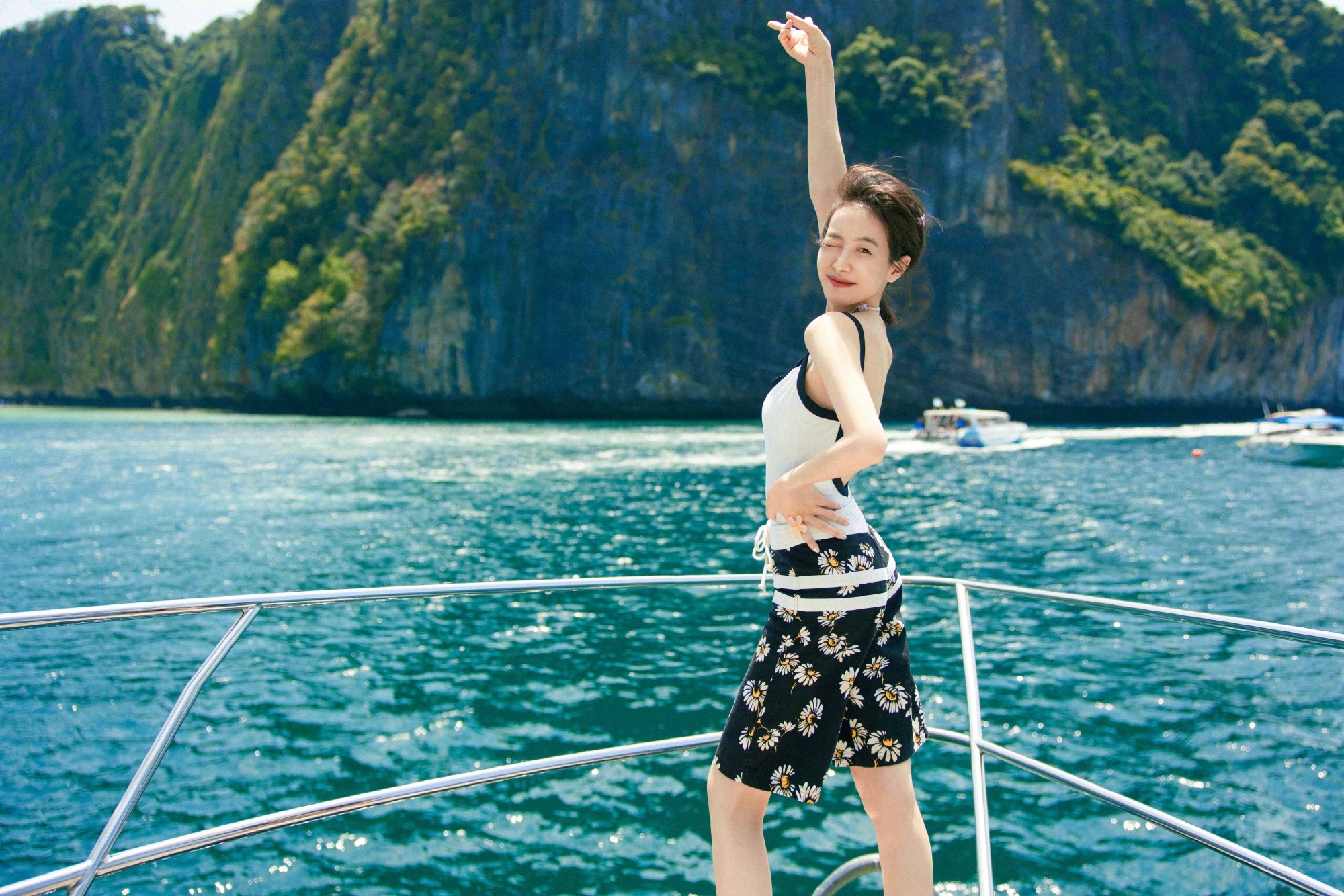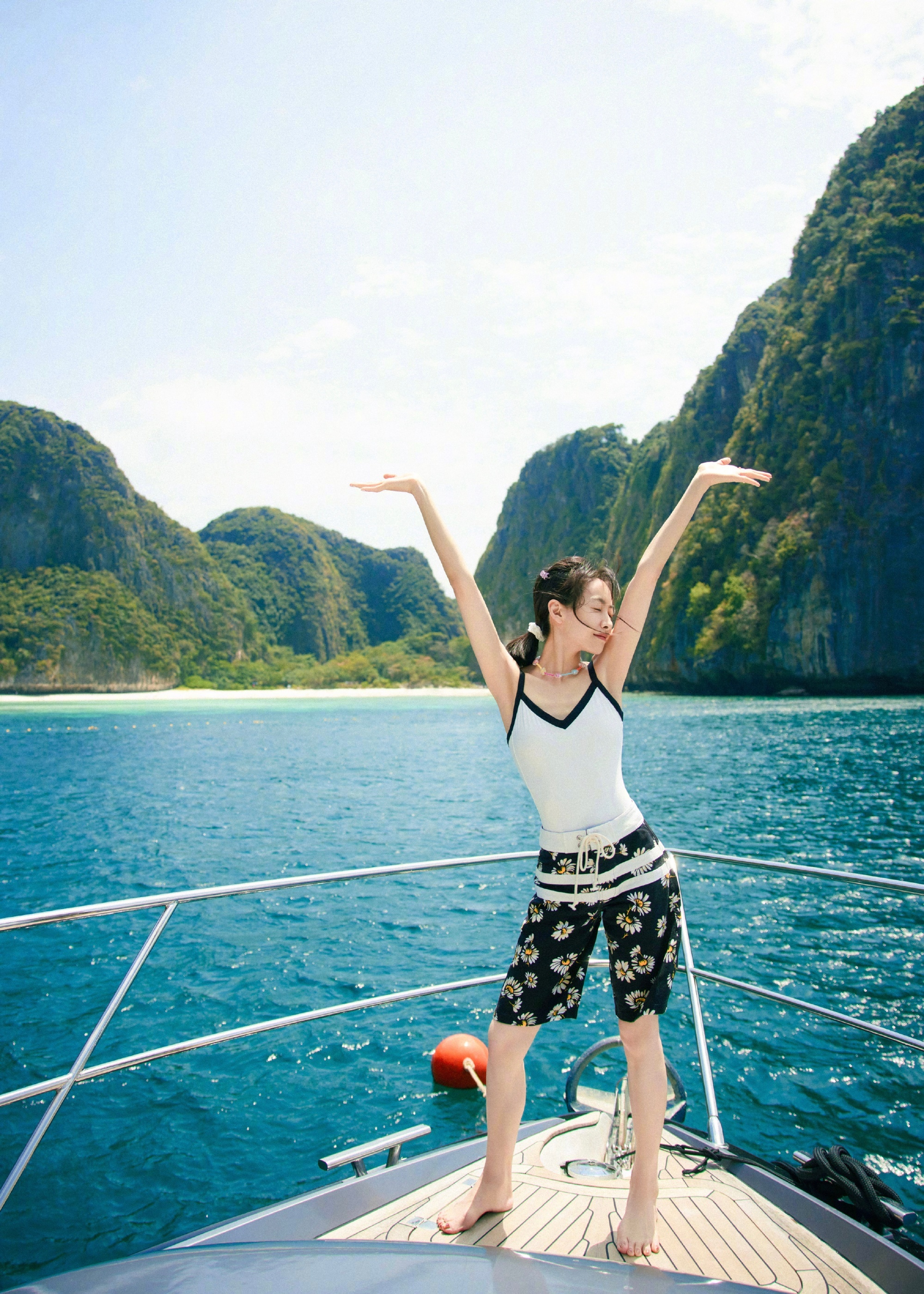 宋茜假日私服,白色吊带短裤,海边的浪漫氛围满满。宋茜