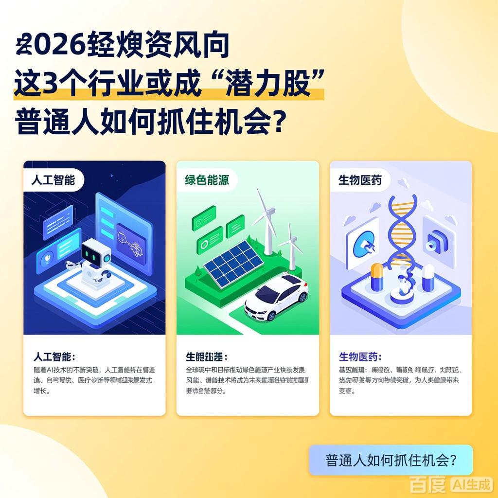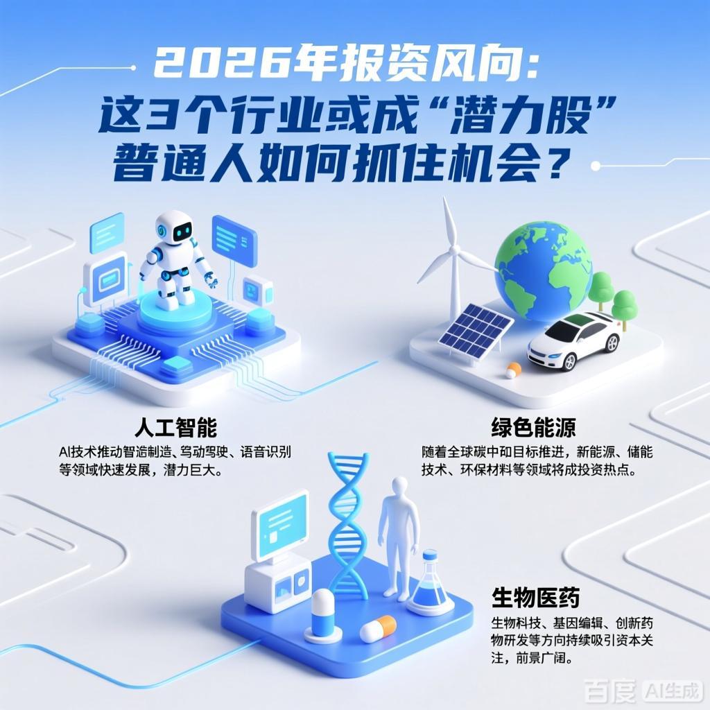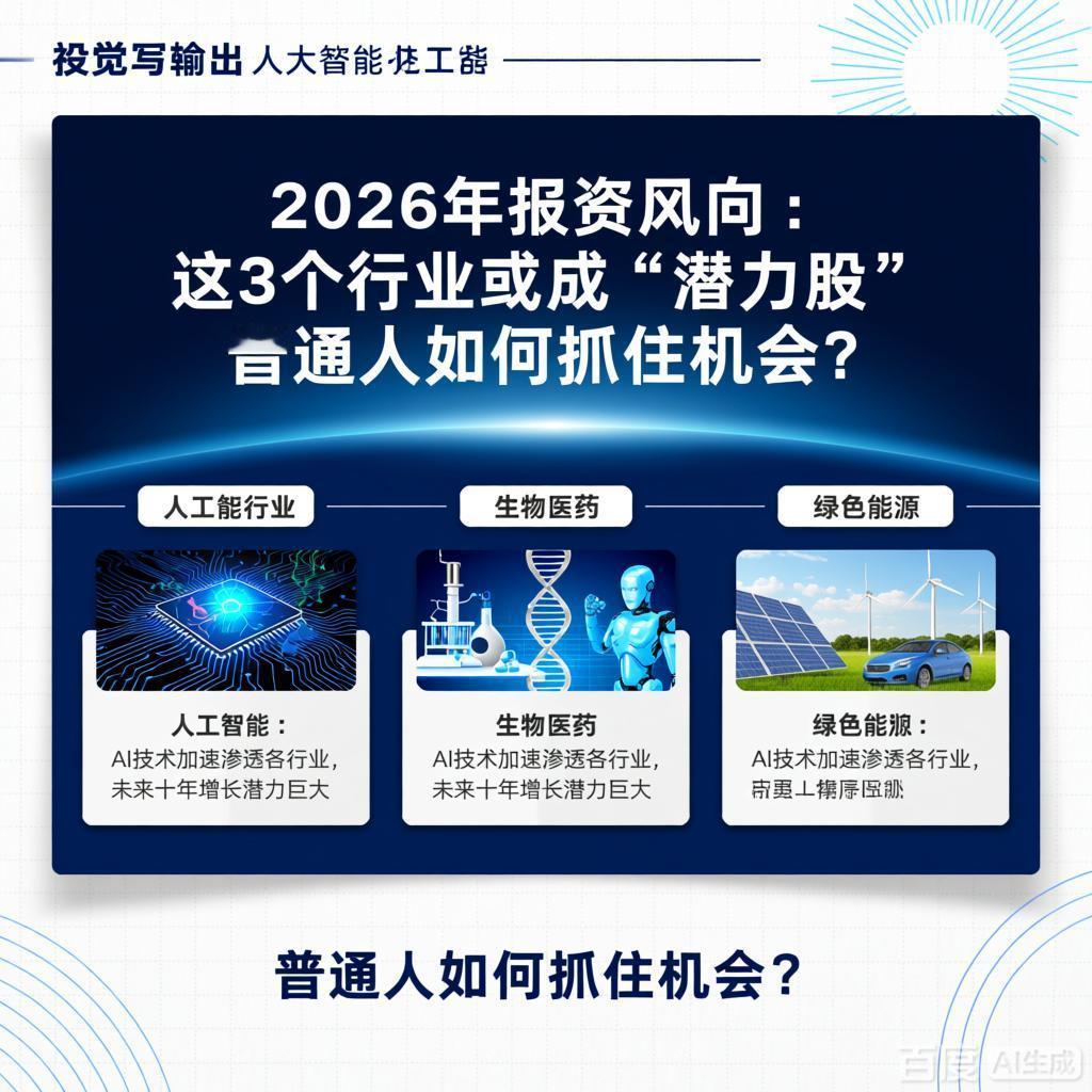 2026年投资风向:这3个行业或成“潜力股”,普通人如何抓住机会? 2025年岁末,中国经济在韧性增长与结构升级中迈向新阶段。随着“十五五”规划开局,投资市场正迎来新一轮机遇与挑战。作为深耕热点新闻的博主,我观察到三大行业正崭露头角,成为普通人财富增长的“潜力股”。本文将深度剖析这些领域,并为你提供实用策略,助你把握时代红利。 一、人工智能:从技术突破到产业落地,普通人如何参与? 2025年,我国人工智能产业规模突破9000亿元,企业数量超5300家,大模型技术已实现物理认知深化与推理效能提升。2026年,这一趋势将加速:智能算力占比突破35%,国产芯片在部分场景规模化应用,技术从前端服务向研发、生产等核心领域延伸。 普通人如何抓住机会? 职业转型:学习AI基础技能(如Python、机器学习),进入AI产品经理、数据标注师等新兴岗位。 投资布局:关注AI产业链上游(芯片、算力)和下游应用(医疗、教育)的龙头企业。 生活应用:利用AI工具提升效率,如智能写作助手、个性化推荐系统,降低创业门槛。 二、绿色能源:政策红利与需求爆发,普通人如何分一杯羹? 2025年,锂电行业受动力电池与储能需求驱动,头部企业排产计划大幅上调,全年增速突破50%。宁德时代、比亚迪等企业加速扩产,储能电池出货量预计2026年突破200GWh。同时,光伏、风电等清洁能源技术成本持续下降,全球能源转型加速。 普通人如何抓住机会? 职业选择:进入新能源产业链,如电池研发、储能系统设计、光伏安装等岗位。 投资策略:布局锂电、光伏、风电等细分领域,关注技术领先企业。 生活实践:安装家庭光伏系统,参与社区共享储能项目,降低能源成本。 三、生物医药:创新与老龄化双轮驱动,普通人如何借势? 2026年,生物医药行业将迎来技术突破与产业化落地的关键跨越。基因编辑、细胞治疗、AI辅助药物研发等领域加速发展,同时老龄化趋势推动医疗需求持续增长。 普通人如何抓住机会? 职业发展:学习生物医药基础知识,进入临床试验、医疗器械销售、健康管理等岗位。 投资方向:关注创新药、医疗器械、健康管理等细分领域,选择研发实力强的企业。 健康管理:利用基因检测、AI健康监测等工具,提前预防疾病,降低医疗支出。 普通人如何抓住2026年投资机遇? 明确投资目标:根据风险承受能力,选择长期持有或短期波段操作。 学习基础技能:通过在线课程、书籍等途径,提升行业认知与投资能力。 分散投资:避免将所有资金投入单一行业,通过指数基金、ETF等工具分散风险。 关注政策红利:紧跟“十五五”规划方向,选择政策支持的行业。 保持耐心:投资是长期过程,避免因短期波动而盲目跟风。 结语:2026年,普通人也能成为“潜力股”! 2026年,中国经济将延续韧性增长,人工智能、绿色能源、生物医药三大行业将成为普通人财富增长的“潜力股”。无论是职业转型、投资布局,还是生活实践,每个人都有机会抓住时代红利。记住,投资不仅是财富的积累,更是对未来的布局。从现在开始,学习、实践、坚持,你也能成为2026年的赢家! 未来赚钱行业 互动:你对哪个行业最感兴趣?准备如何布局?欢迎在评论区分享你的观点!