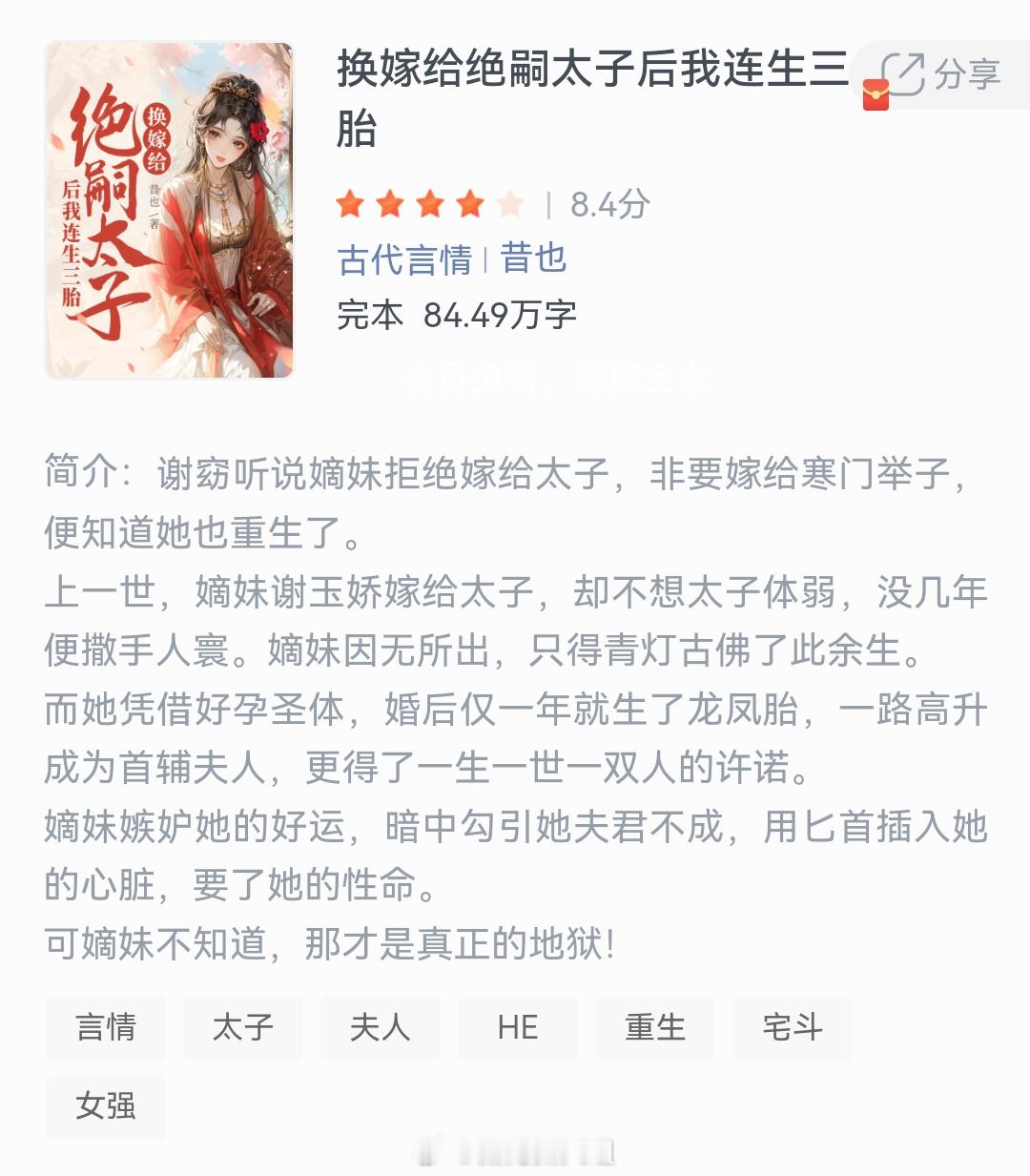 《换嫁给绝嗣太子后我连生三胎》作者:昔也谢窈听说嫡妹拒绝嫁给太子,非要嫁给寒门举