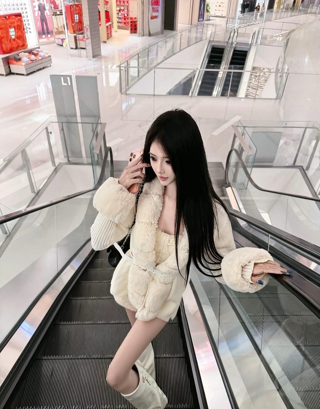 毛茸茸的白色外套,搭配长直发,电梯上的甜美少女风!👗👠💄