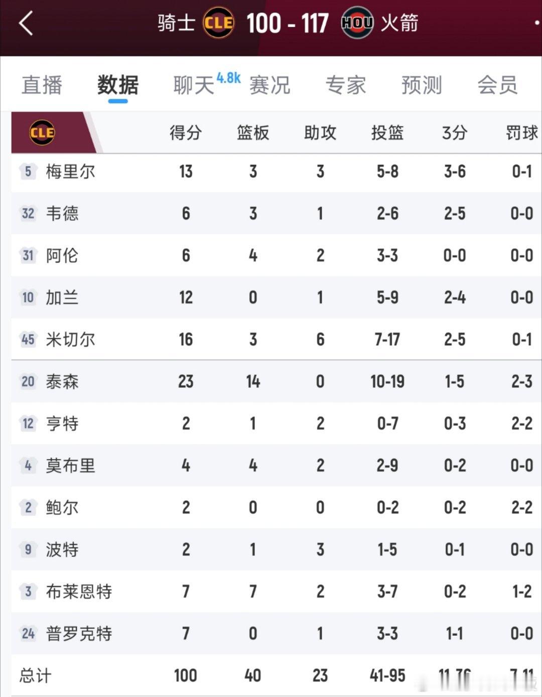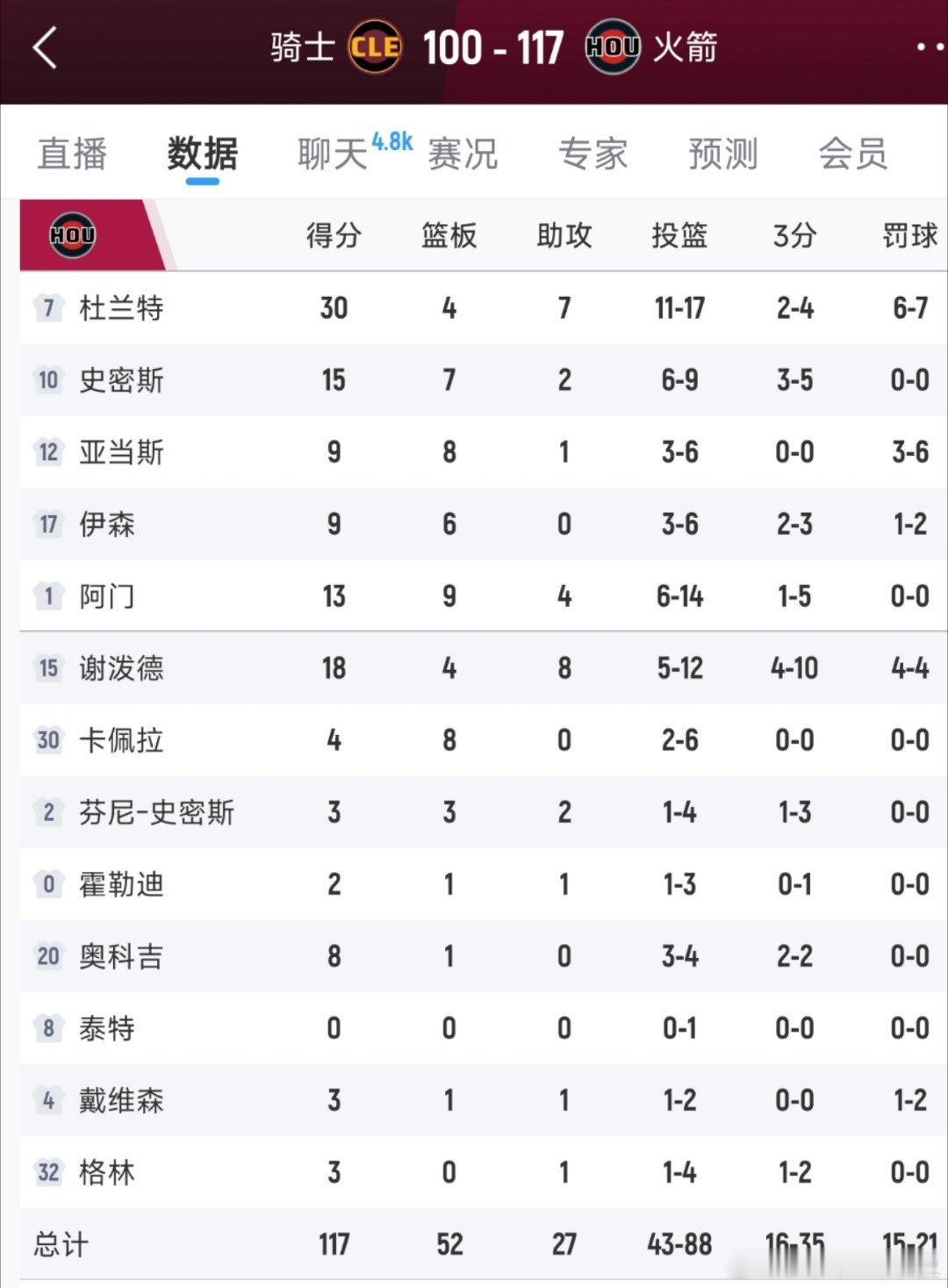 火箭主场117-100大胜骑士,排名反超湖人升至西部第4!杜兰特30分,谢泼德18分8助4断,申京缺席;杰伦-泰森23分14板,米切尔16分,加兰12分骑士vs火箭