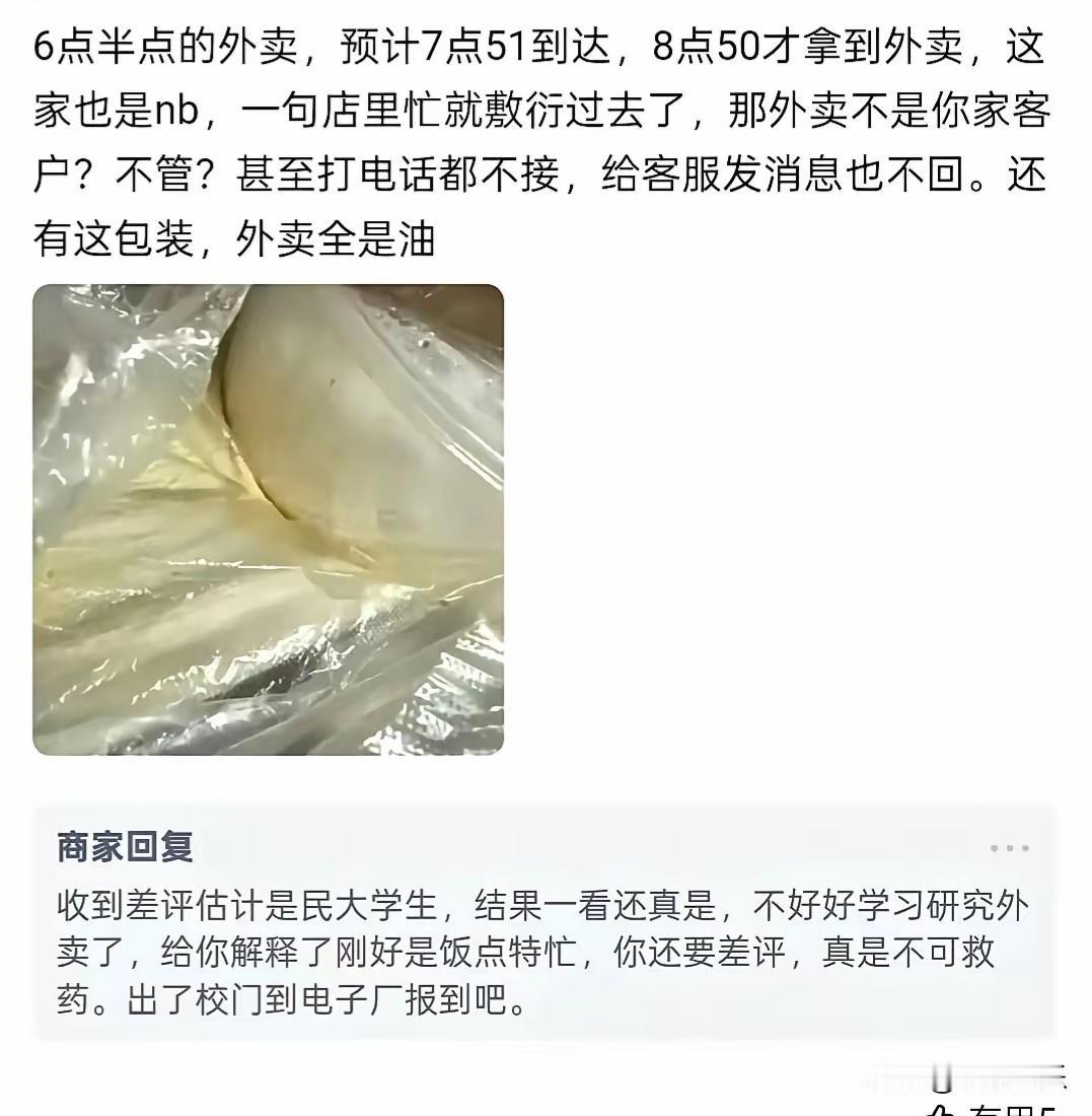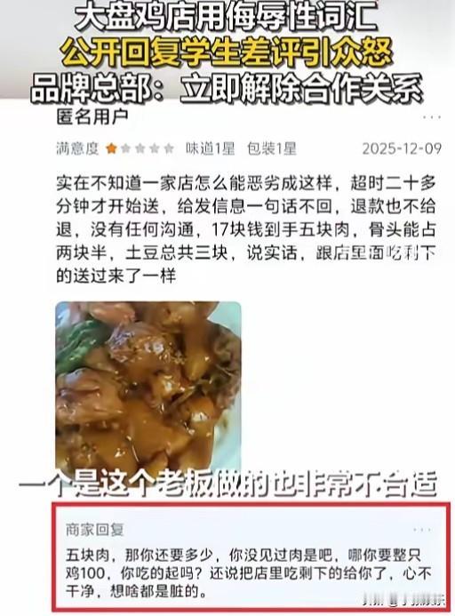 12 月 26 日,甘肃兰州发生了一件让人愤怒的事。一高校门口的大盘鸡店,竟然用侮辱性词汇公开回复学生的差评,这一下可激怒了众人 那些给了差评的学生,本只是正常反馈问题。可商家倒好,不仅不反思自己的问题,还嘲讽学生“学历低”,恶意说学生“毕业后只能送外卖、进电子厂”。这不是公然的职业歧视嘛,学生们的情感被深深伤害了,这谁能受得了啊。 事件闹大后,品牌总部出来说话了。总部要求涉事商家向学生公开道歉,可这商家居然拒绝了。而且,总部已经和它解除合作关系并责令摘牌了,这店家还在共同群里辱骂总部负责人,这店家的态度真是太恶劣了。 店家以为自己这样横就能没事,结果呢,不仅失去了和品牌总部的合作,还被大家都知道了它的恶劣行径。它之前那些侮辱学生的话,现在都成了打在自己脸上的巴掌,以后这生意怕是也不好做了。 从法律角度讲,商家这种侮辱他人、进行职业歧视的行为,是侵犯了他人的名誉权等合法权益的。学生们要是追究起来,这店家得承担法律责任。而且,品牌总部和它解除合作也是符合商业合作规定的,因为店家的行为损害了品牌形象。 兰州这家大盘鸡店因为侮辱学生差评,引发众怒,最后落得个被解约的下场。 这告诉我们,不管是商家还是个人,都得尊重他人,不能口无遮拦地去侮辱、歧视别人。否则,一定会自食恶果。 大家觉得这店家后续还会有啥举动呢?学生们会不会进一步采取措施维护自己权益呢?