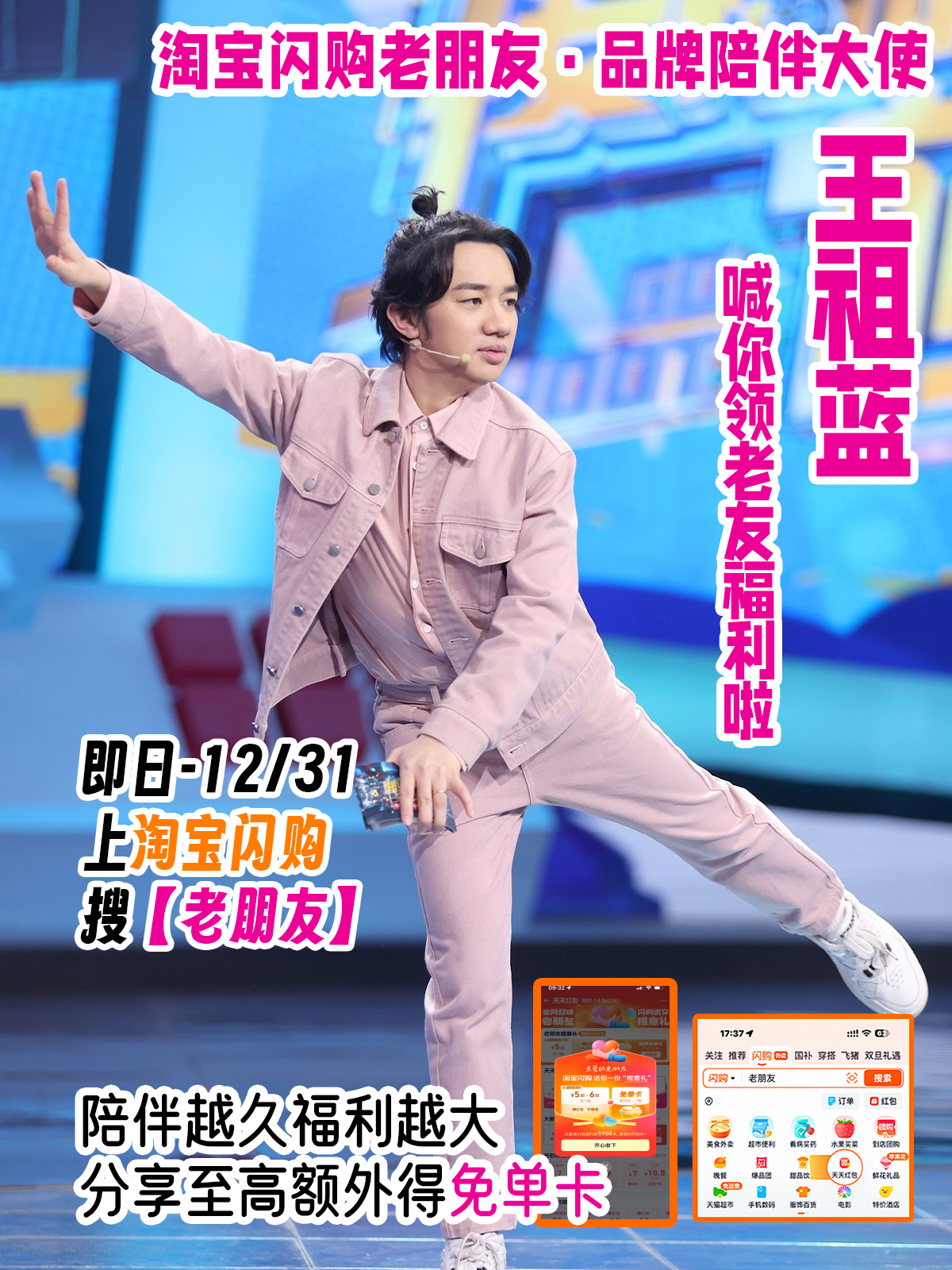 省钱党必码!超级周末老客专属福利,王祖蓝教你躺着省钱~上淘宝闪购️搜【老朋友】,注册越久红包越给力,至高可领7张免单卡!分享给身边老友,最高额外再得免单卡,12.31截止别犹豫!