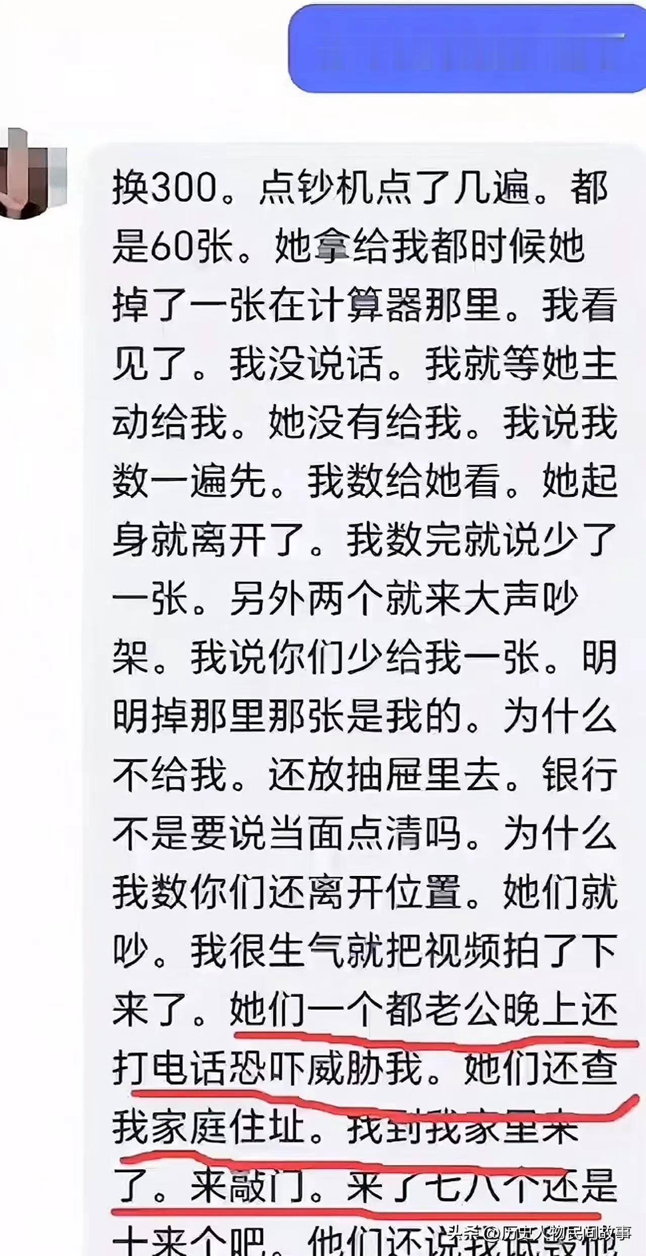 湖南娄底的“5元风波”,越看越气!女子到农商行取300元(全要5元面额),点钞机显示60张,可柜员递钱时掉了1张,捡起来直接塞抽屉里。 女子数完只有59张,要求归还却被柜员敷衍,甚至直接离岗。无奈之下,她拍下现场视频发网求助,没想到麻烦找上门——涉事柜员的家属不仅打电话恐吓,还带着十几人(女子自述)查到她家地址敲门,说她“诋毁人”。 最终民警调解,银行、柜员及家属都道了歉,但网友吵翻了: 🔹 核心不是5块钱!银行操作不规范,还疑似泄露客户隐私,太可怕; 🔹 上门威胁已违法,不能一句“冲动”就翻篇! 去银行取钱少给钱、遇不公,到底该怎么维权?五元现金花 现金事件5元钱的启示 素材来源于网络,侵权删除。