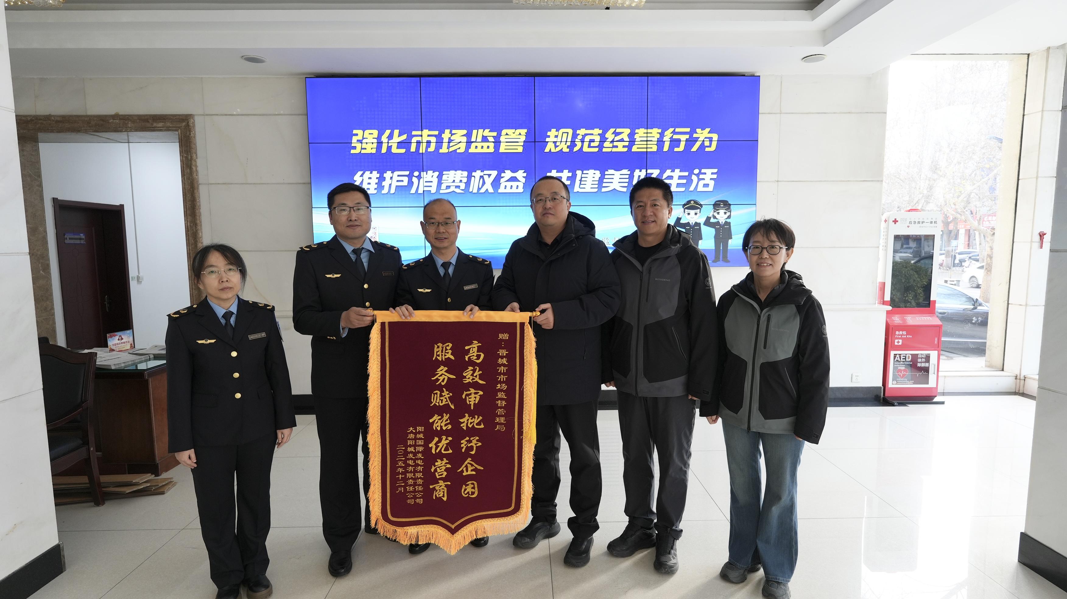 12月26日上午,阳城国际发电有限责任公司一行三人将一面锦旗送到了晋城市市场监督管理局三级调研员王进军手中,对市局的高效服务和暖心帮办表示诚挚谢意。“高效审批纾企困服务赋能优营商”十四个字,不仅承载着企业的由衷认可,更生动诠释了市局优化营商环境、助力市场主体发展的务实举措。