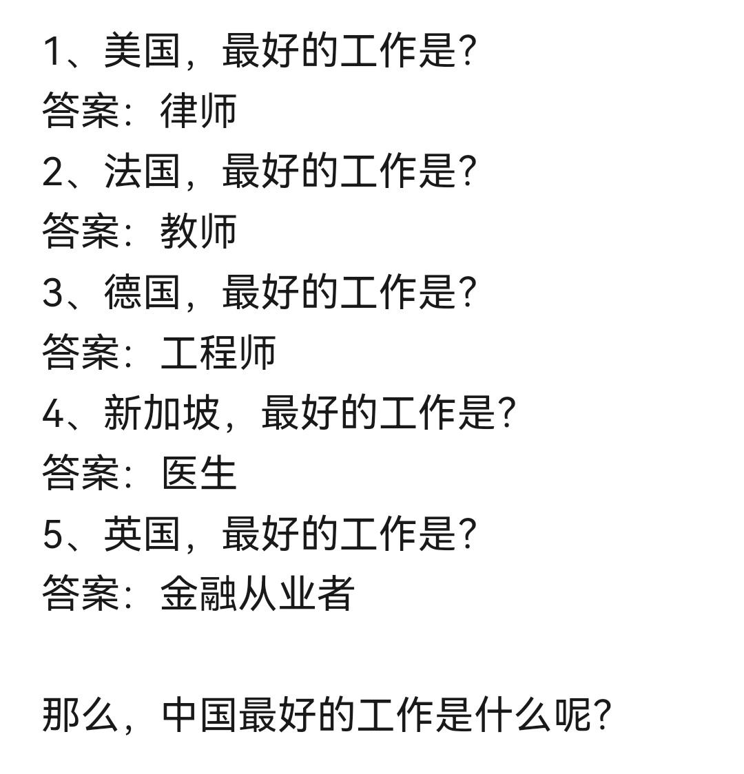 中国最好的工作是什么? 要说中国最好的工作,那公务员必须拥有姓名。工作稳定,不用担心失业风险,就像有个铁饭碗稳稳捧在手里。而且福利待遇超棒,医保、公积金啥的都很齐全。 教师也相当不错。每年有寒暑假,这可是多少人羡慕不来的超长假期。能教书育人,看着学生成长成才,成就感满满。 还有医生,救死扶伤很伟大。随着经验积累,医术越来越精湛,收入也会水涨船高,社会地位也高。不过每个工作都有辛苦的一面,公务员要处理各种事务,教师备课改作业,医生值班熬夜,但这些工作确实有独特的魅力和优势。 工作 公务员 铁饭碗职业