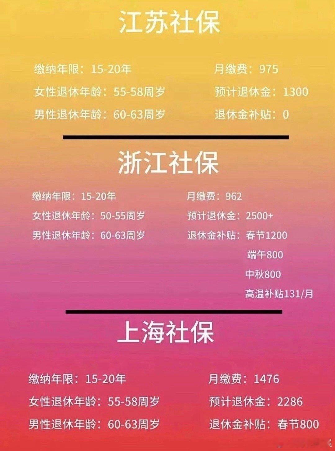 江浙沪长三角天花板,养老待遇反差也太离谱了!经济:上海>江苏>浙江缴费:上海>江苏>浙江退休年龄:江苏和上海持平,女性还比浙江晚退养老金+补贴:浙江>上海>江苏江苏直接垫底!交最多的钱,熬最晚的退休年纪,拿最差的养老待遇,咱江苏十三太保经济个个能打,养老这块的落差真的让人想不通,凭啥江苏人就该这样?!