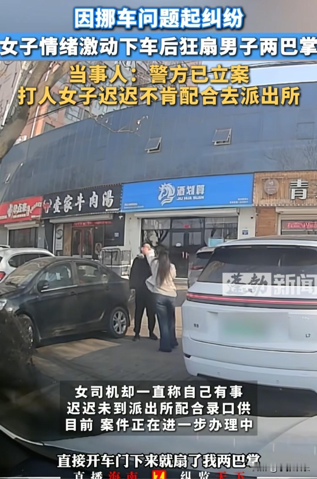 太离谱!衡水女司机挪车起纠纷,扇人两巴掌还先报警,事后却躲着不配合! 河北衡水近日发生一起挪车纠纷,女司机的一系列奇葩操作让人瞠目结舌。先是动手扇人,接着倒打一耙报警,事后还躲着不配合处理,这究竟是怎么回事呢? 男子只是因为挪车这件小事,就无端被女司机扇了两巴掌,他克制没有还手,却没想到女司机还恶人先告状报警。而事后女司机不配合去派出所处理,让男子陷入了一种无奈和憋屈的境地,明明自己是受害者,却似乎无处伸冤。 女司机的行为本身就很过分,动手打人违反了基本的道德和法律规范,而她先报警以及事后不配合的举动,更是让冲突不断升级。她这种蛮不讲理的做法,完全不顾及他人感受和事情的正常处理流程。 女司机以为自己先报警就能占据主动,但她这种颠倒黑白、事后躲着不配合的行为,只会让她在这件事情中更加理亏。她的荒唐操作迟早会被真相所揭露,受到应有的批评和处理。 从法律角度看,动手打人是违法行为,女司机应该为自己的行为负责。而她不配合警方处理的做法也是不合法的,警方有权采取相应措施来促使事情得到妥善解决。 衡水女司机在挪车纠纷中的不当行为引发关注,她的一系列荒唐举动让人对她的行为表示质疑。 在生活中遇到纠纷,我们应该保持理性,通过合法途径解决问题,而不是像这位女司机一样胡搅蛮缠。 最终女司机会不会受到应有的惩罚?这件事情后续会如何发展呢?
