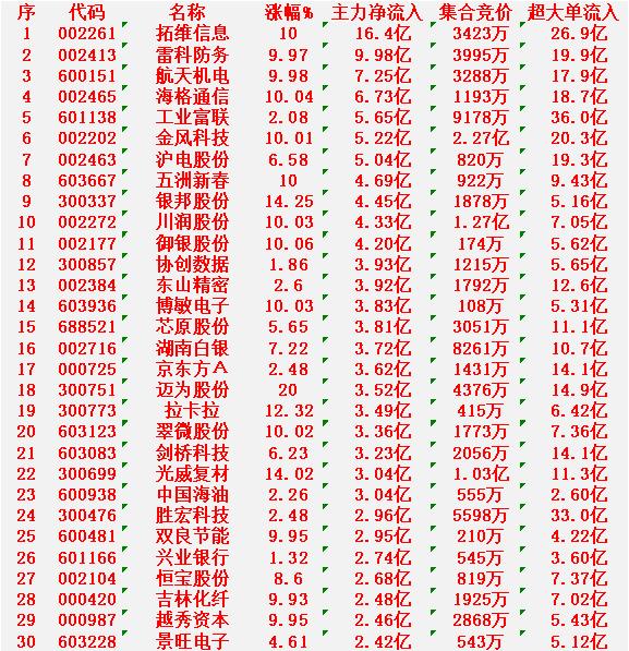 12月29日收盘,主力资金,已经大幅卖出的30名单: 中际旭创:跌幅 -1.45%,净流入 -16.0 亿元 阳光电源:跌幅 -2.86%,净流入 -13.9 亿元 多氟多:跌幅 -8.23%,净流入 -12.1 亿元 洛阳钼业:跌幅 -4.51%,净流入 -12.0 亿元 天际股份:涨幅 +0.02%(基本平盘),净流入 -10.8 亿元 江西铜业:涨幅 +1.37%,净流入 -10.8 亿元 中国卫通:涨幅 +6.18%,净流入 -9.46 亿元 宁德时代:跌幅 -1.36%,净流入 -8.48 亿元 东百集团:跌幅 -9.37%(接近跌停),净流入 -8.12 亿元 中兴通讯:跌幅 -1.13%,净流入 -7.79 亿元 12月29日收盘,主力资金“大幅买入”的30名单: 拓维信息:净流入16.4亿元 雷科防务:净流入9.98亿元 航天机电:净流入7.25亿元 海格通信:净流入6.73亿元 工业富联:净流入5.65亿元 金风科技:净流入5.22亿元 沪电股份:净流入5.04亿元 五洲新春:净流入4.69亿元 银邦股份:净流入4.45亿元 川润股份:净流入4.33亿元 御银股份:净流入4.20亿元 协创数据:净流入3.93亿元 东山精密:净流入3.92亿元 博敏电子:净流入3.83亿元 芯原股份:净流入3.81亿元 湖南白银:净流入3.72亿元 京东方A:净流入3.62亿元 迈为股份:净流入3.52亿元 拉卡拉:净流入3.49亿元 翠微股份:净流入3.36亿元 剑桥科技:净流入3.23亿元 光威复材:净流入3.04亿元 中国海油:净流入3.04亿元 胜宏科技:净流入2.96亿元 双良节能:净流入2.95亿元