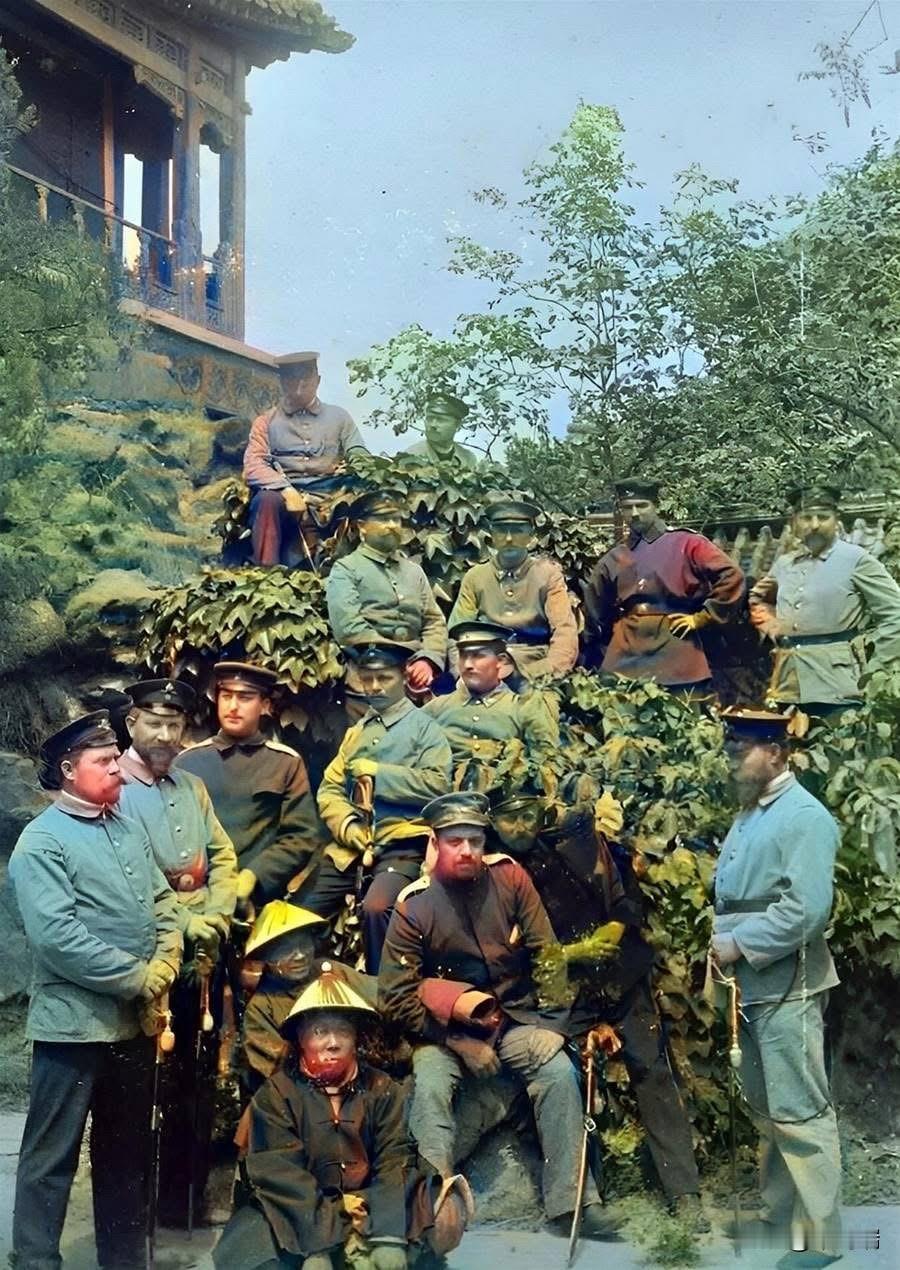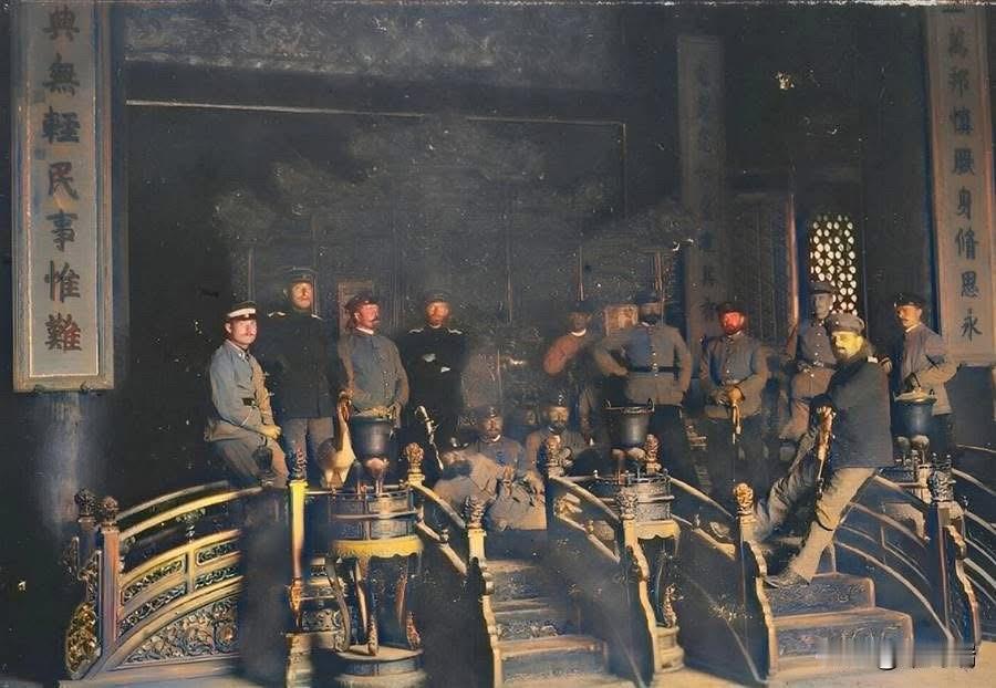 当年,八国联军攻入北京,慈禧太后带着光绪帝早已仓皇西逃,偌大的皇宫里只剩下一些太监和宫女们手足无措。 德军进入紫禁城,他们找到2位太监,让他们带路到了妃嫔们经常游玩的后花园。在后花园,德军拉住太监一起合照,照片中的太监,脸色紧张忐忑,却因为被德军拉住没法脱身。 除了后花园,德军还到了干清宫,他们簇拥着坐上龙椅,争相拍照留念,这些照片。