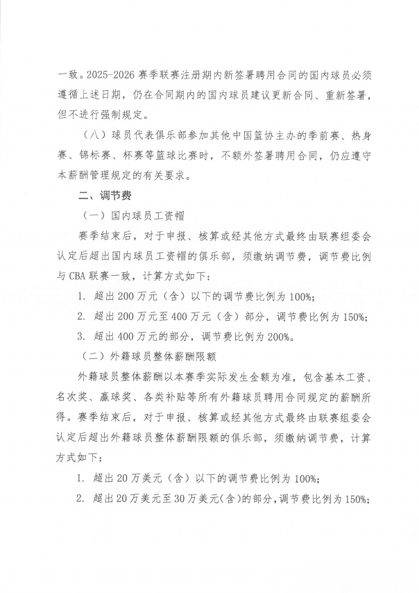 7.调节费:国内球员超出200万元(含)以下的调节费比例为100%,超出200万元至400万元(含)部分,调节费比例为150%,超出400万元的部分,调节费比例为200%。外籍球员超出20万美元(含)以下的调节费比例为100%,超出20万美元至30万美元(含)的部分,调节费比例为150%,超出30万美元以上的部分,调节费比例为200%。