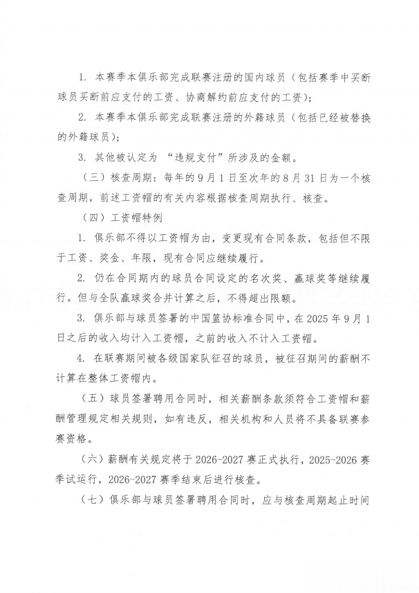 6.薪酬有关规定将于2026-2027赛正式执行,2025-2026赛季试运行,2026-2027赛季结束后进行核查。
